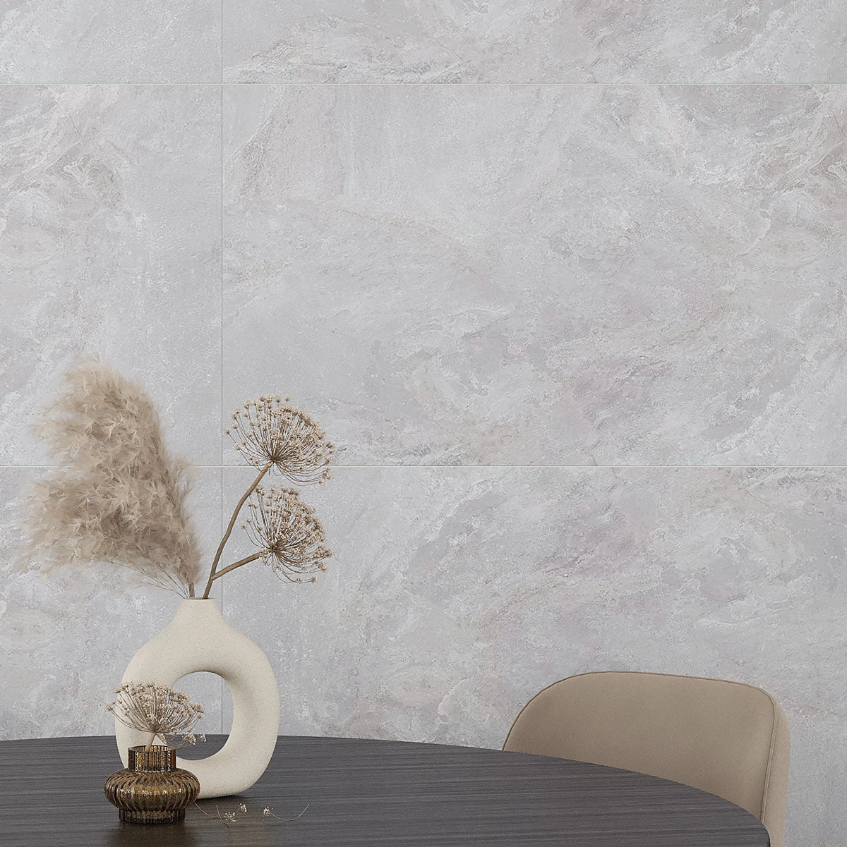This modern, slab porcelain floor tile has a water-resistant finish for use in bathrooms and kitchens. The natural stone-look gray color blend adds rustic charm to your home with this large format tile piece. Add an extra layer of sophistication for a slab backsplash or seamless floor tile.
