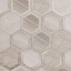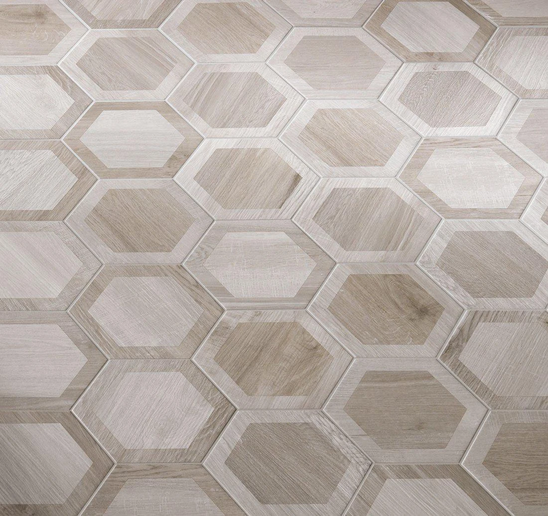 They are approved for both interior and exterior installation, and are not only a beautiful choice for your home, but can be used in high-traffic areas such as offices, restaurants, hotels and inns, retail shops, or bars! The combination of light gray colors, matte finish, and wood-look texture in a modern hexagon tile creates the perfect design to complement any style of home or business!