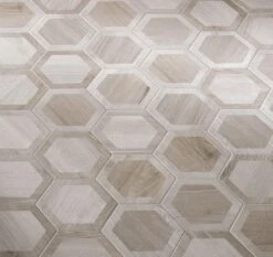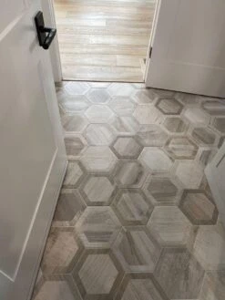 These 9.5″ x 9.5″ gray porcelain tiles are a two-toned hexagon with a wood grain finish to accent a French Country or rustic farmhouse look. Each box includes 10.4 square feet, with a mix of tones within the color scheme, as pictured!