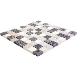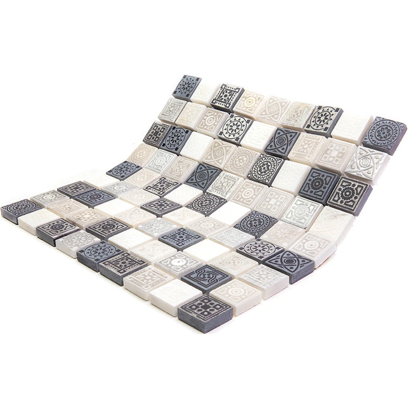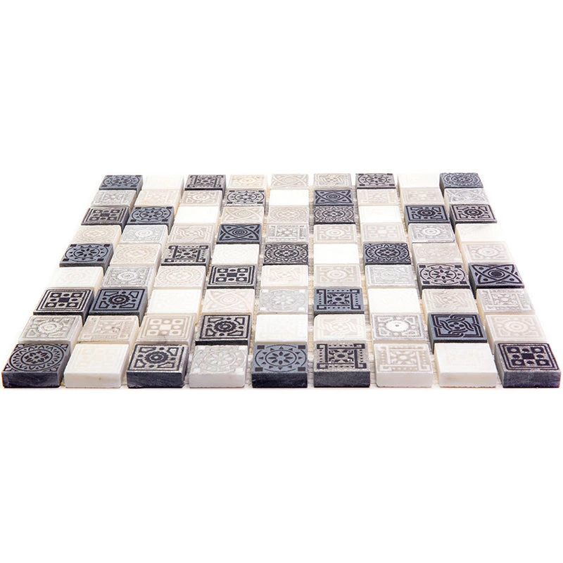 Add some unique ethnic motives to your modern home with our marvelous etched tiles. Various patterns of this natural stone mosaic bring a detailed catchy look and grace any surroundings. The gray mosaic color matches any palette and sets a sophisticated elegant feel. Simple square form and a mesh backing make the installation process fast and simple. This polished tile does not require any special maintenance, it is easy to clean, long-lasting and great for indoor areas. It is approved for different light traffic floors and wall installations including a kitchen or bathroom backsplash, shower walls, a feature wall, a decorative border, TV stand surrounds, and other accents. Revamp your bathroom, living room, kitchen, hallway, or foyer and enjoy a stylish, exotic look.