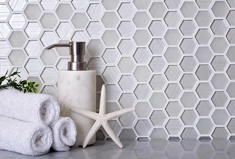 A: Tile Club’s Fabrique White Hexagon Glass Mosaic Tile is approved for indoor wall use, including your kitchen backsplash, fireplace surround, accent wall, bar backsplash, shower wall, bathtub surround – you name it! The icy silver-white in this hexagon tile can also be safely used for interior and wet floor areas such as shower floors