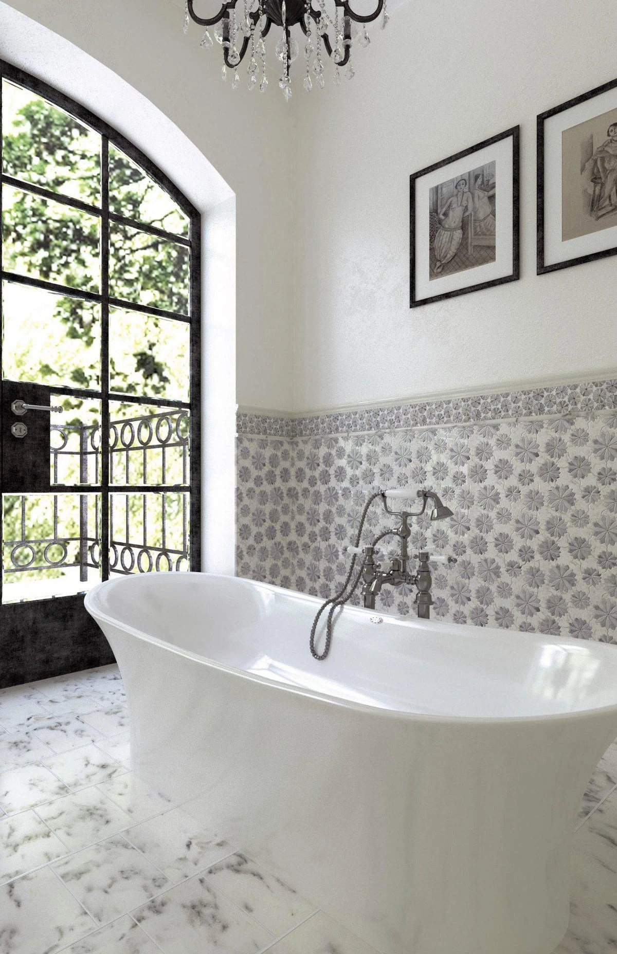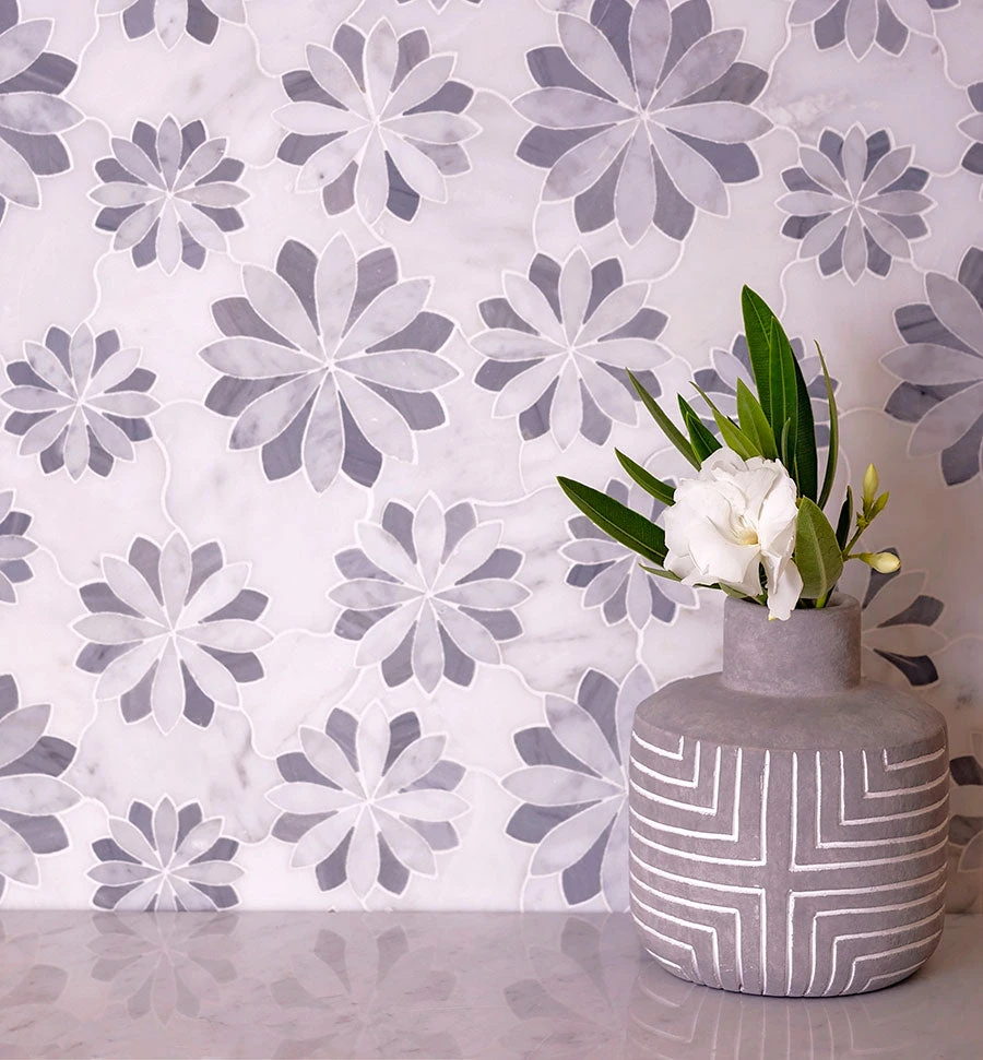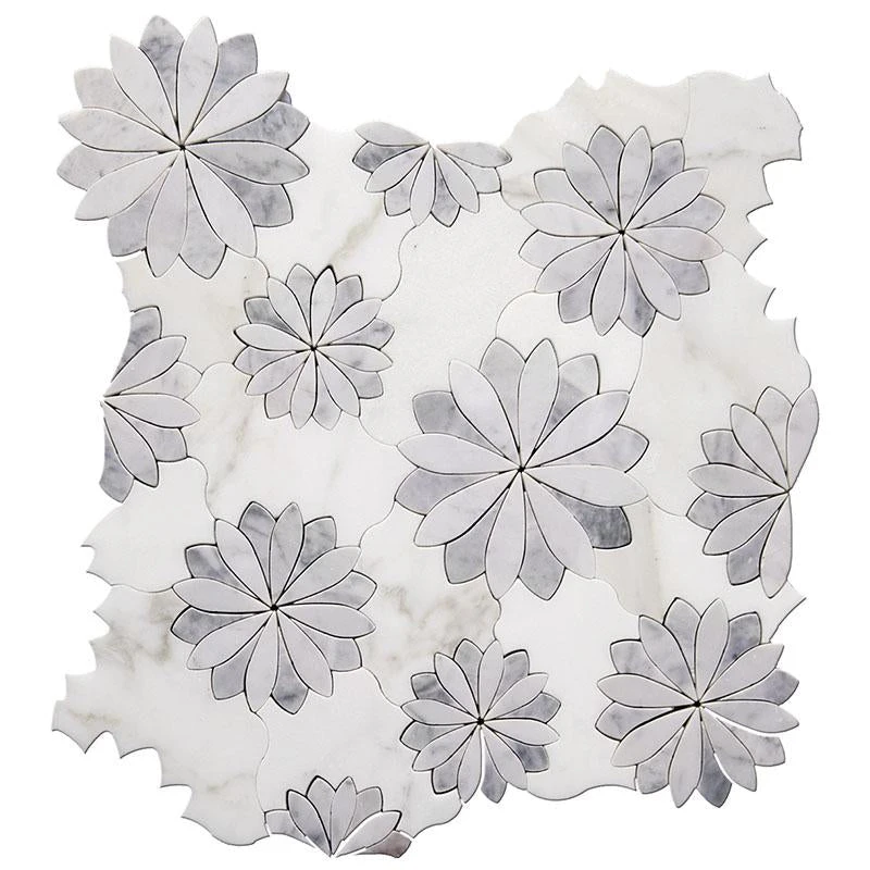 Fill your home with the everlasting blossom of our Floral Eternity waterjet tile! Carrara tile and Bardiglio marble* pieces are composed in a dazzling pattern that brings an organic feel to your space. The white and gray palette fits any color scheme and becomes the bright focal point of any design. Floral Eternity is an incredible natural stone mosaic tile that looks rich and full of life! These mosaic sheets form a continuous floral pattern and are interlocked together for the fast and easy installation process. Explore your imagination with this unforgettable flower mosaic tile. Suitable for low traffic rooms and bathroom floors, this product creates gorgeous marble floors. The creative design is an ideal choice to revamp your bathroom and kitchen. Use it for a marvelous white Carrara backsplash or a brilliant decorative wall, and not a single gray flower will stay unnoticed.