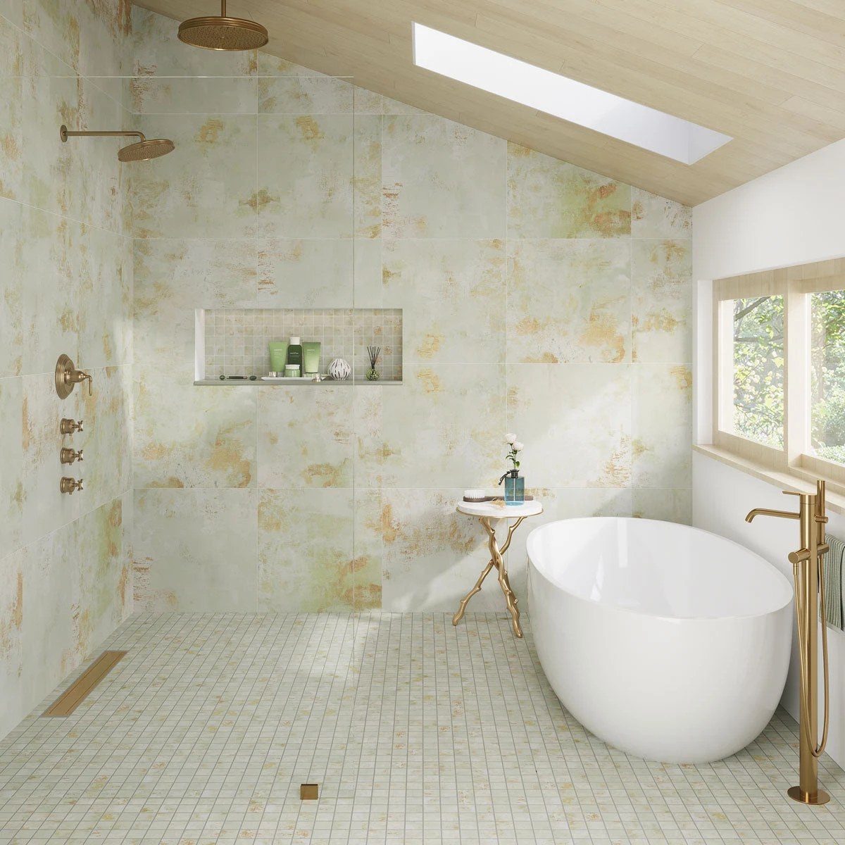Gilded Age Green Natural 24×24 is approved for interior and exterior walls, residential and commercial floors, shower walls, and surfaces exposed to heat, making them perfect for any remodeling project. Whether you’re creating an inviting atmosphere in your home or upgrading your business facilities with some elegant touches, these dreamy square porcelain tiles will be the envy of all who enter! Why not bring timeless elegance into your space today?