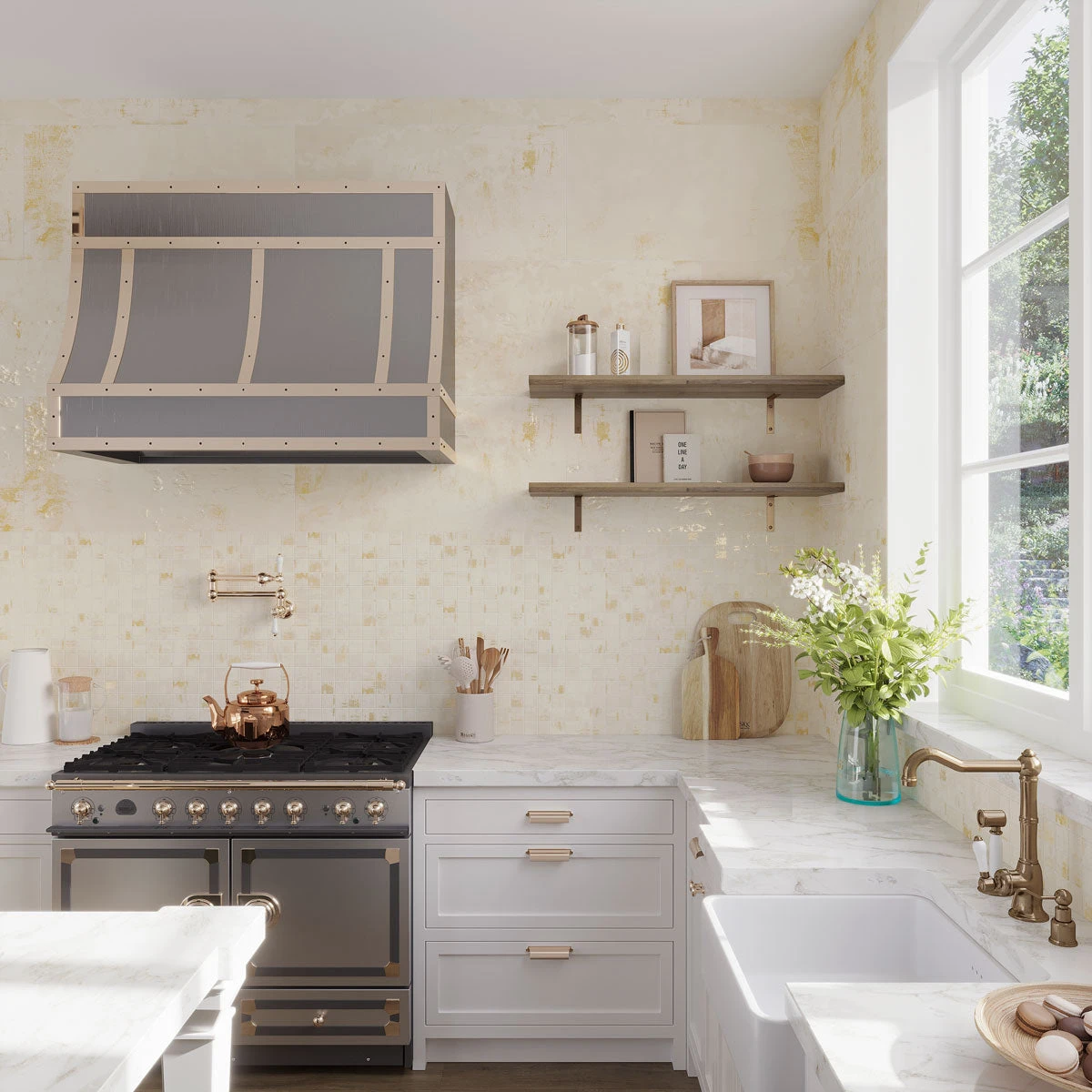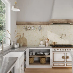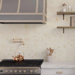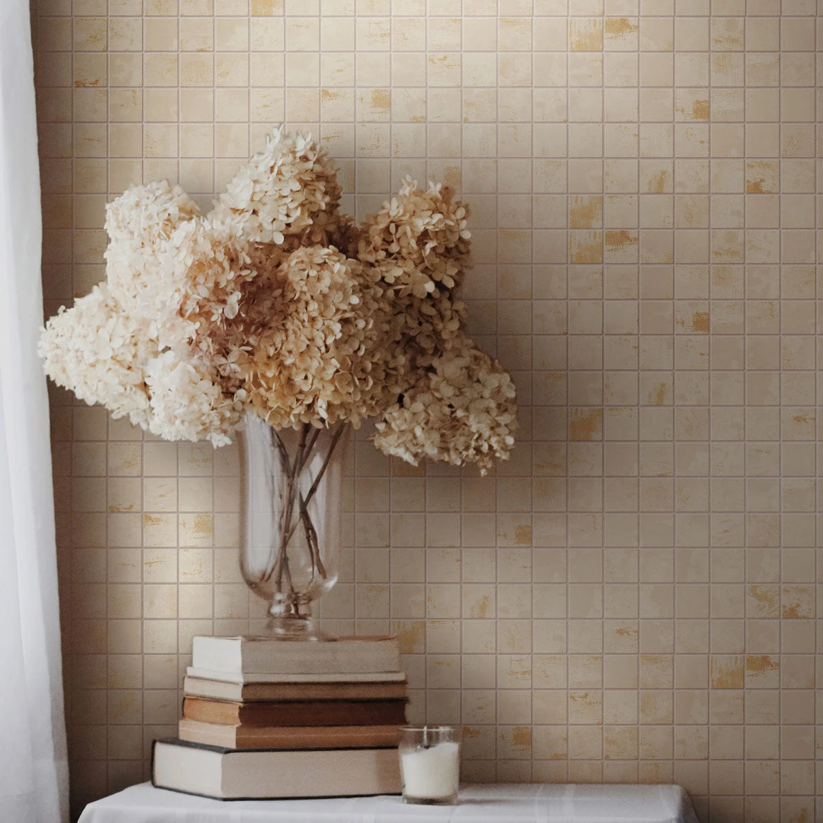 Instantly transform any room with these Gilded Age Ivory Natural Mosaic Porcelain tiles! These unique tiles are an Impressionist-inspired masterpiece that will truly bring life to your home or commercial space. With a dreamy ivory background and gold wash accents, this timeless design is perfect for creating a French country kitchen backsplash, a romantic cottage bathroom, or an elegant wine bar.