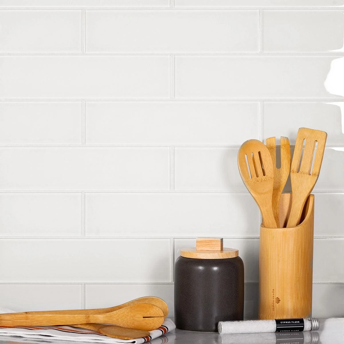 If you’re looking for a light and airy kitchen design with a white glass subway tile, you’ve found the perfect design! These gorgeous tiles complement any home décor thanks to their pure white color, classic subway shape, and polished finish. They’re best installed with a glass adhesive. To play with the look and feel of your white glass subway tile walls and floors, create a contrasting looking by pairing with tile with gray grout, or arrange them in a vertical stack pattern, or even a playful herringbone tile layout!