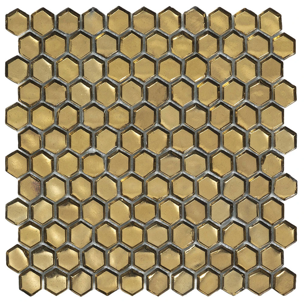 The royal look of this glass tile is expressed in its unforgettable golden color and fashionable geometric pattern. Hexagon tile chips are brought together to deliver a lively modern style that will bring movement to your home. The glossy reflective surface bounces natural light and can turn any space into a real treasure. The individual tile chips are mounted on a flexible mesh backing, making it easy to install this pattern over large walls and floors!