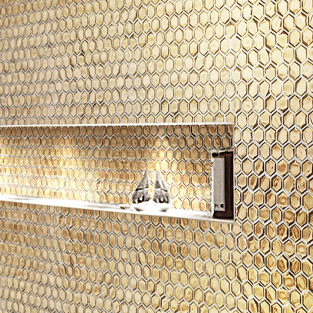 Glass is a durable, stain-resistant material that does not require special maintenance. You can safely apply this glass hexagon tile to walls and light traffic floors. Whether you want to cover the whole space or leave just a little accent piece, it will add beautiful detail and glossy gold color. A gold backsplash, a feature wall, a decorative niche, a fireplace surround, and even a mirror board will not go unnoticed! Use this hexagonal tile in your kitchen, bathroom, living room, bedroom or any other indoor area.