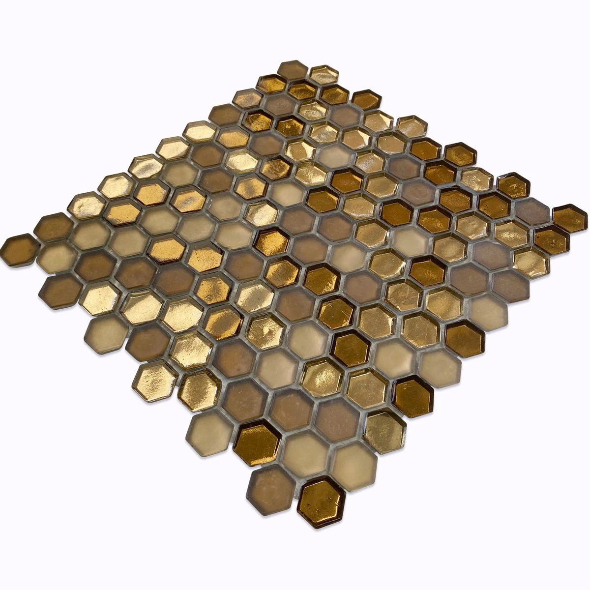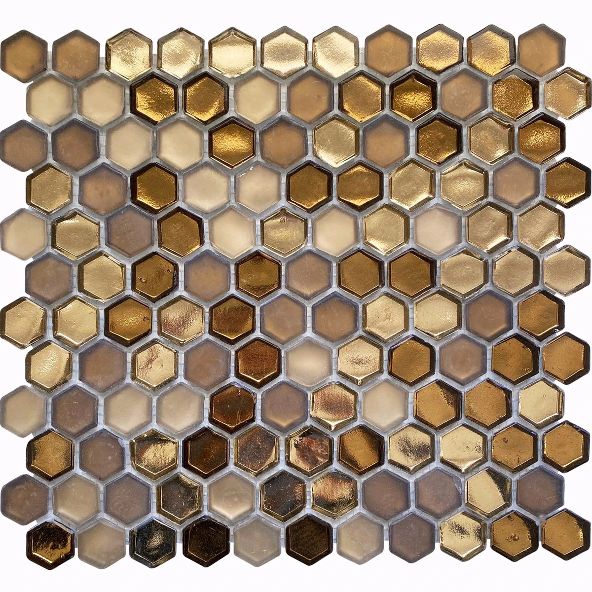 This honeycomb hexagon patterned tile adds beautiful dimension to our Glossy Gold hexagon glass tiles with a mix of pale and bold gold colors, and finishes from polished to matte. This gorgeous glass mosaic tile creates a warm glow in any inside space! Transform your walls and floors with this glamorous design, perfect for a dazzling detail for a living room accent wall or eye-catching fireplace surround to create a beautiful focal point in the spaces that you entertain and relax.