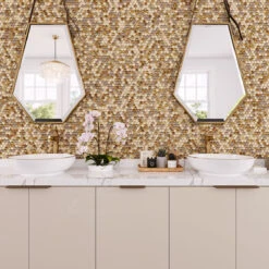 Glass tile is a great choice for your kitchen as well – this gold hexagon tile can be used as a backsplash behind your stove and under your cabinets, where the glossy chips can reflect light and warm up your space. It’s a great flooring option for indoor residential spaces, combining a practical floor material with a dramatic installation that will transform any room! It’s also a great choice for wet areas, perfect for when you want to add a little glamour to your shower enclosure or bathroom wall.