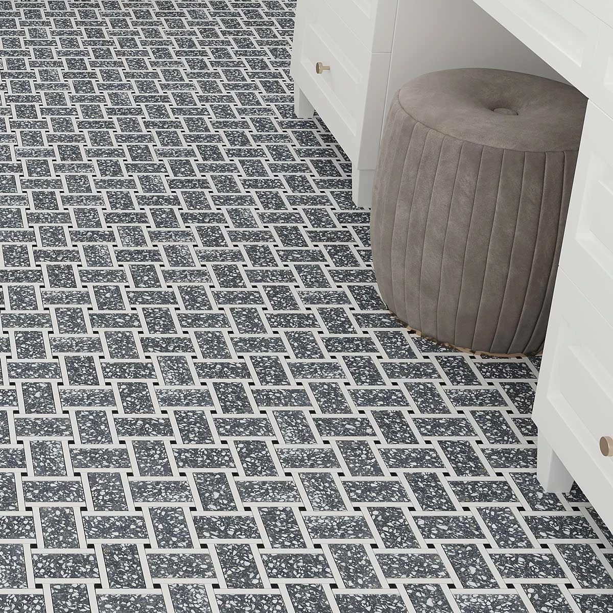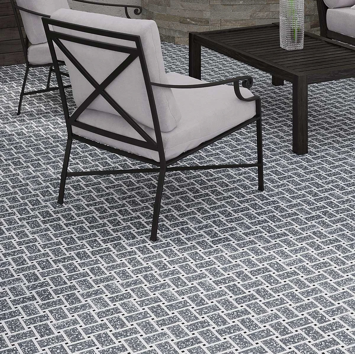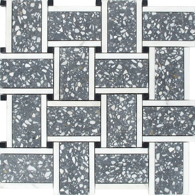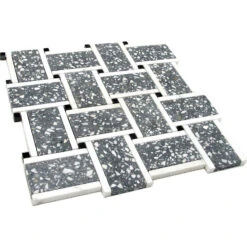 Our Gray and White Terrazzo Basket Weave Mosaic Tile is perfect for adding a modern geometric element to your home. The unique basket weave pattern is sure to add style and beauty to any space. The gray and white color palette is perfect for creating a sleek, contemporary look. Whether you use it for your floors, walls or showers, this tile is sure to make a statement. The speckled pattern adds a fresh spin to a classic mosaic pattern for floors and walls.