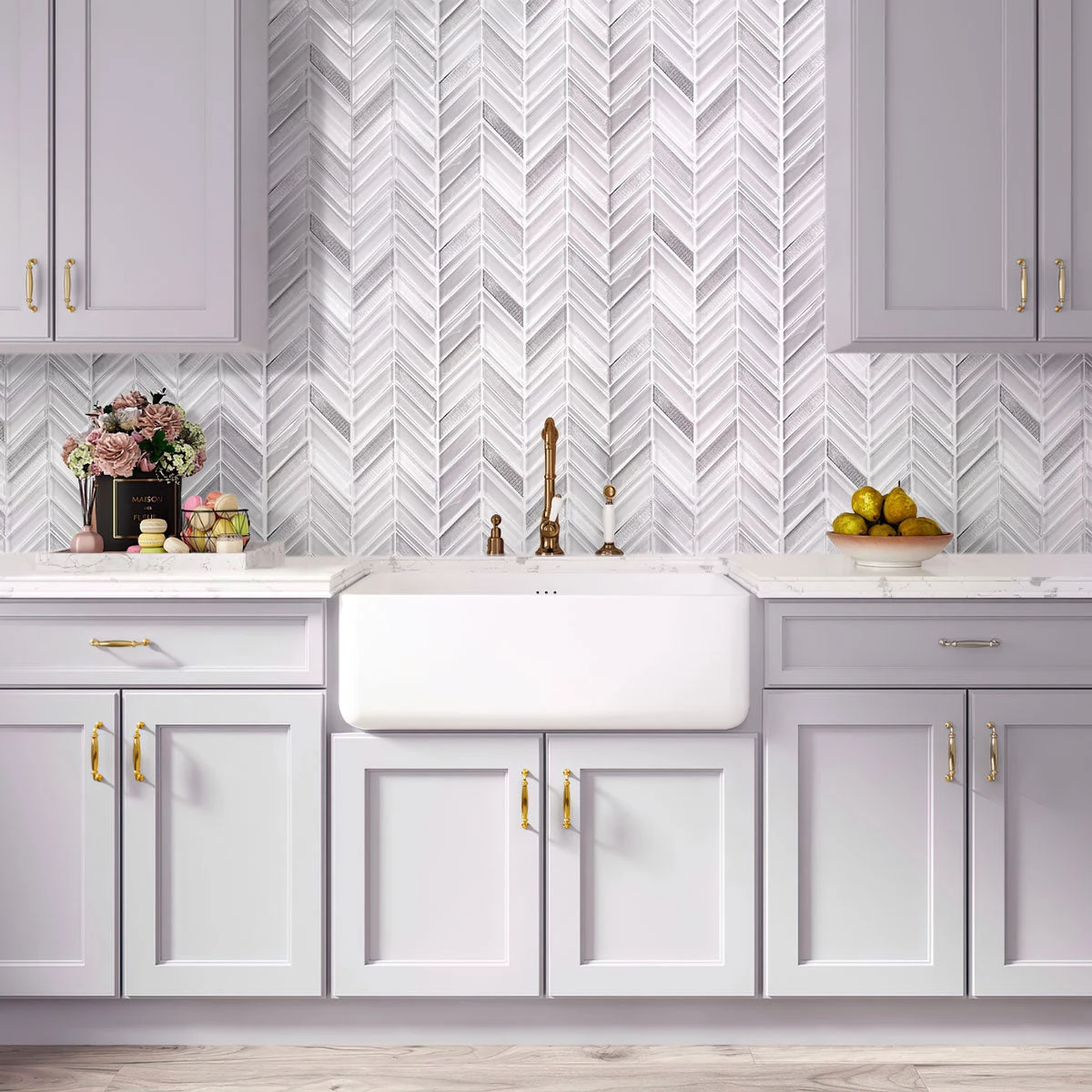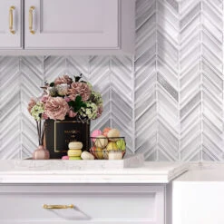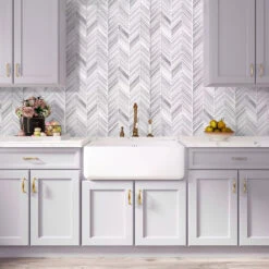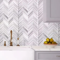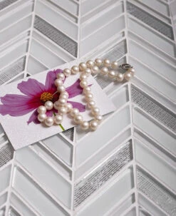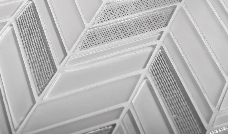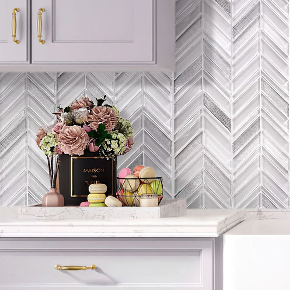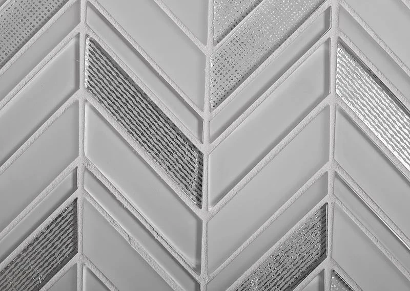 We could see the Ice White Chevron tile making an incredible touch anywhere that needs a patterned touch! The subtle shades of white and silver glass make a timeless combination, with a polished finish and chevron detailing to create a splash in any room. Neutral colors set up a clean, fresh look, and shiny foiled chips add a gentle glamorous feel. Each sheet comes on a mesh back for a problem-free installation. Being stain and mildew-resistant, non-slippery, and easy to wash, they are popular tiles for floors, walls, and shower pans. They are approved for indoor applications as kitchens, bathrooms, living rooms, hallways, foyers. Whether you want to this ice tile for the perfect chevron glass tile backsplash in your kitchen or create a chevron pattern shower floor, it will be a great addition to any modern design.