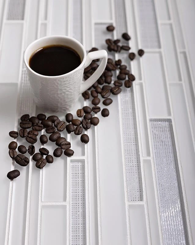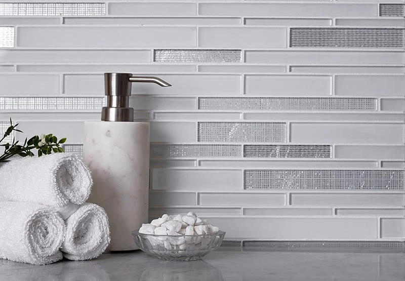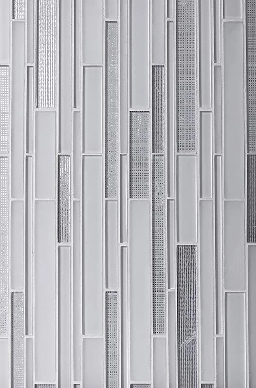 Give your home a trendy look with our Linear Ice White tile. A lively pattern and modest color palette make these mosaics an ideal addition to all-white designs. A combination of white and silver glass pieces brings a clean, refined appeal and matches any color theme. Glossy finish adds a glamorous sleek touch and delivers a subtle sheen. Each sheet comes on a mesh backing for a quick problem-free installation. This mosaic can be used for different types of indoor areas including kitchens, bathrooms, hallways, entrances, living rooms. Sustainable, resistant to mildew, non-slippery, and easy to wash these glass tiles can be applied to light traffic floors, shower pans, and walls. If you are searching for a white and silver backsplash, a decorative border, a niche, or any other accent, our ice tile will be a perfect pick to fulfill your desires.
