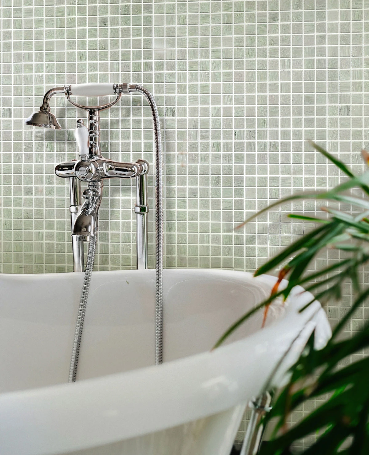 Ready to step outside of your comfort zone and add some color to your space? Use this seafoam green as a colorful kitchen backsplash choice that is easy on the eyes, breathe some minty freshness into a bathroom design with a seafoam tiled wall, or transform your pool water into a natural-appearing body of water with this tile on the borderline or inside. No matter where you choose to install, the tone of this seafoam green will change depending on how the light hits the iridescent glass tiles and the shimmering reflection will infuse any space with extra beauty and drama!
