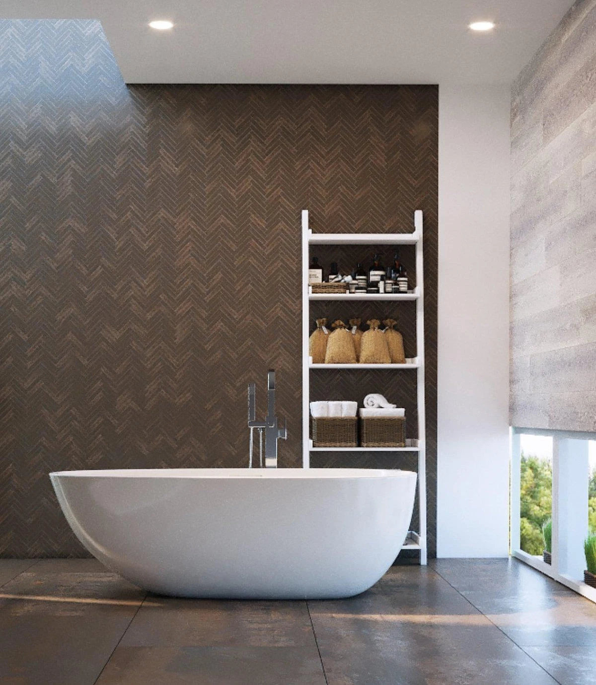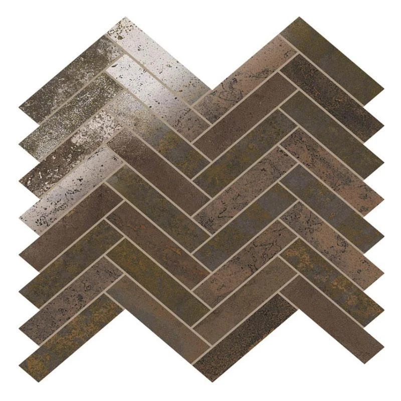 The catchy pattern of our herringbone copper porcelain tile will never go unnoticed in any setting! The subtle metallic copper color throws a hint of a modern industrial style for a unique palette. Porcelain tiles are durable, long-lasting, resistant to moisture, mildew, heat, and cold. They can be washed with regular water and do not need special maintenance. All these features make them a popular versatile solution for a huge range of commercial and residential designs.