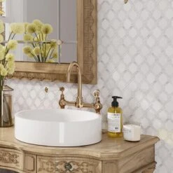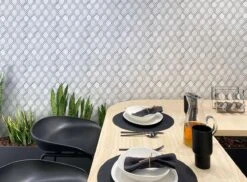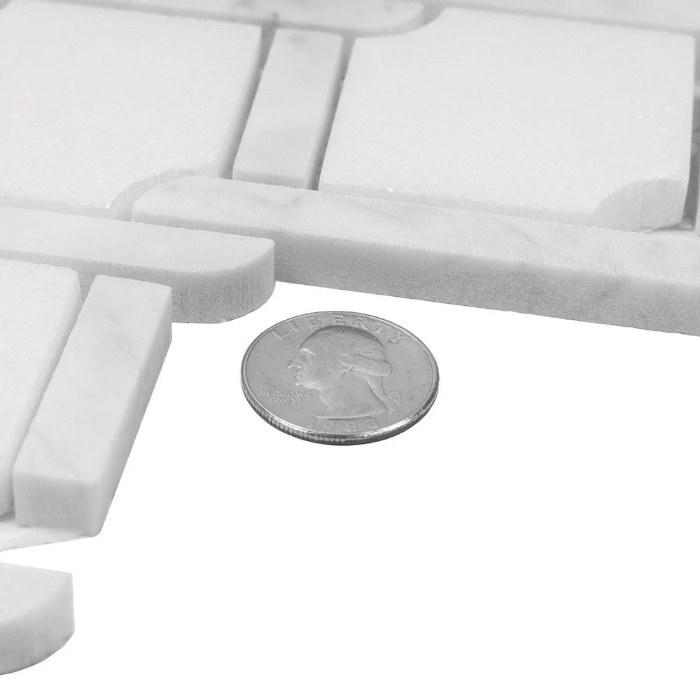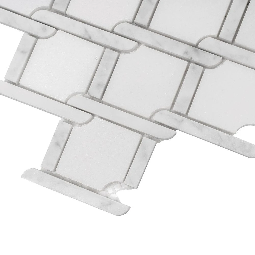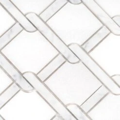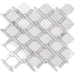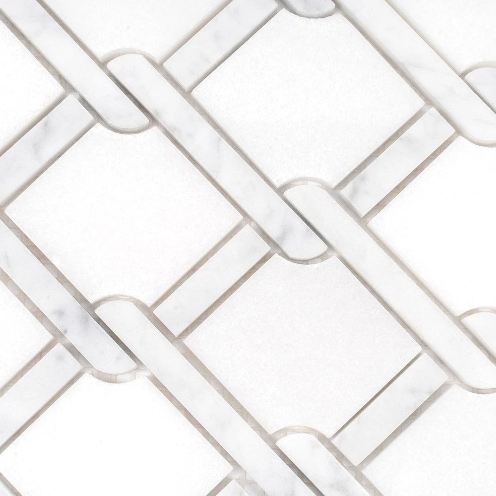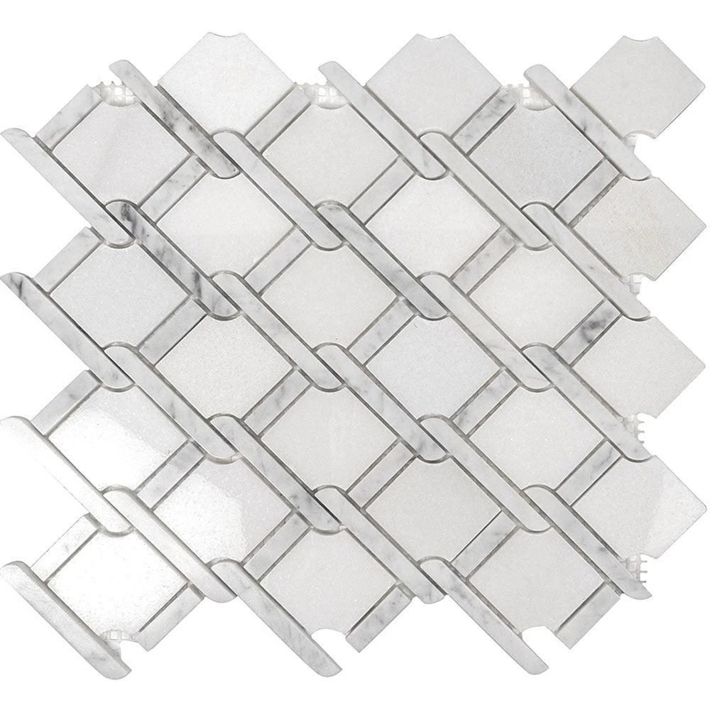 This mosaic tile features the soft white tones of Eastern White and Bianco Carrara marble in a mesmerizing tile pattern. The geometric shapes and the intricate design of this mosaic tile gives a modern spin to the ever-classic marble stone. The rope-like inserts between the shapes add extra character to this artistic tile giving it an unusual aesthetic for distinct backsplash and wall applications. These marble tiles are ideal for both indoor and outdoor use including backsplashes, walls and floors. Ranging from traditional to modern style projects, you can easily integrate these marble tiles into any design.