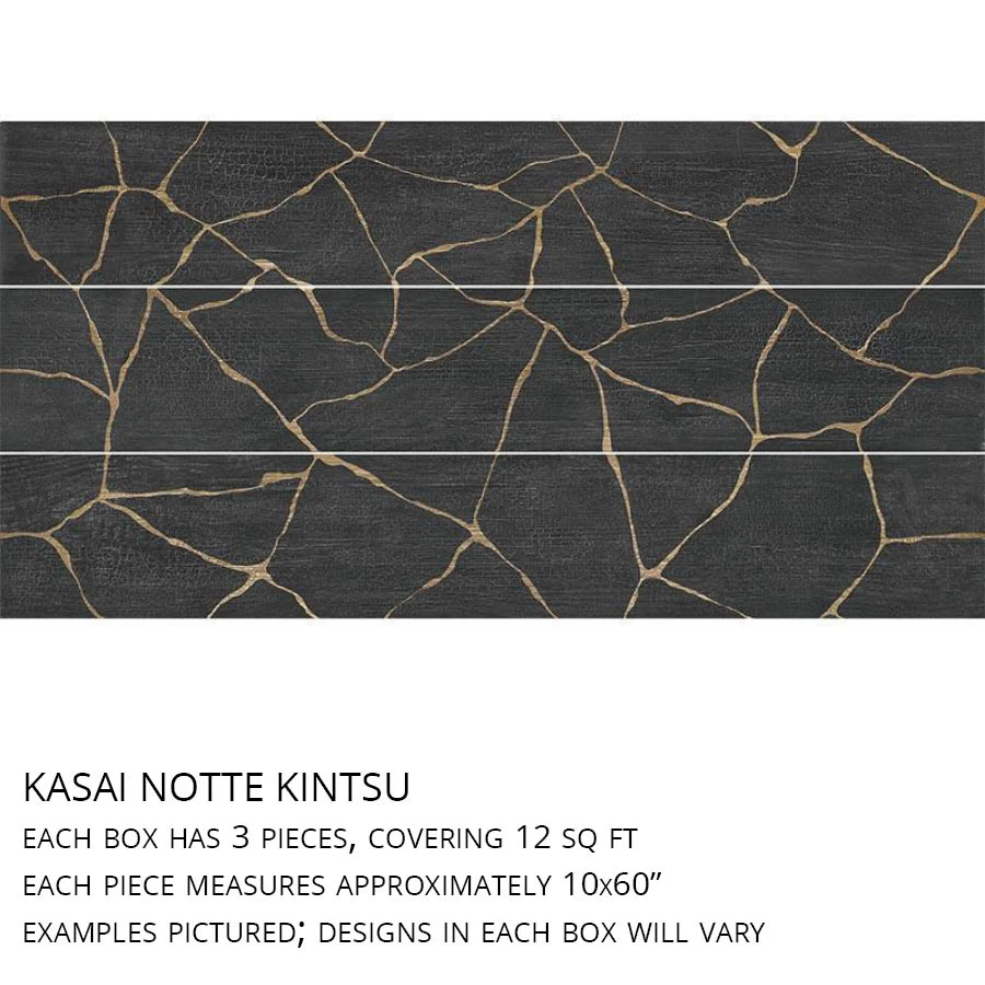 *Each box of the Kasai Notte Kintsu tile contains 3 pieces, each measuring 9.8″ x 59″ to cover 12.105 square feet. The pattern on each tile will vary and can be laid in your preferred arrangement to create a continuous pattern or other design. Can also be paired with the plain black wood-look Kasai Notte tile, or Kasai Notte Sakura flower patterned porcelain tile.