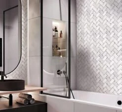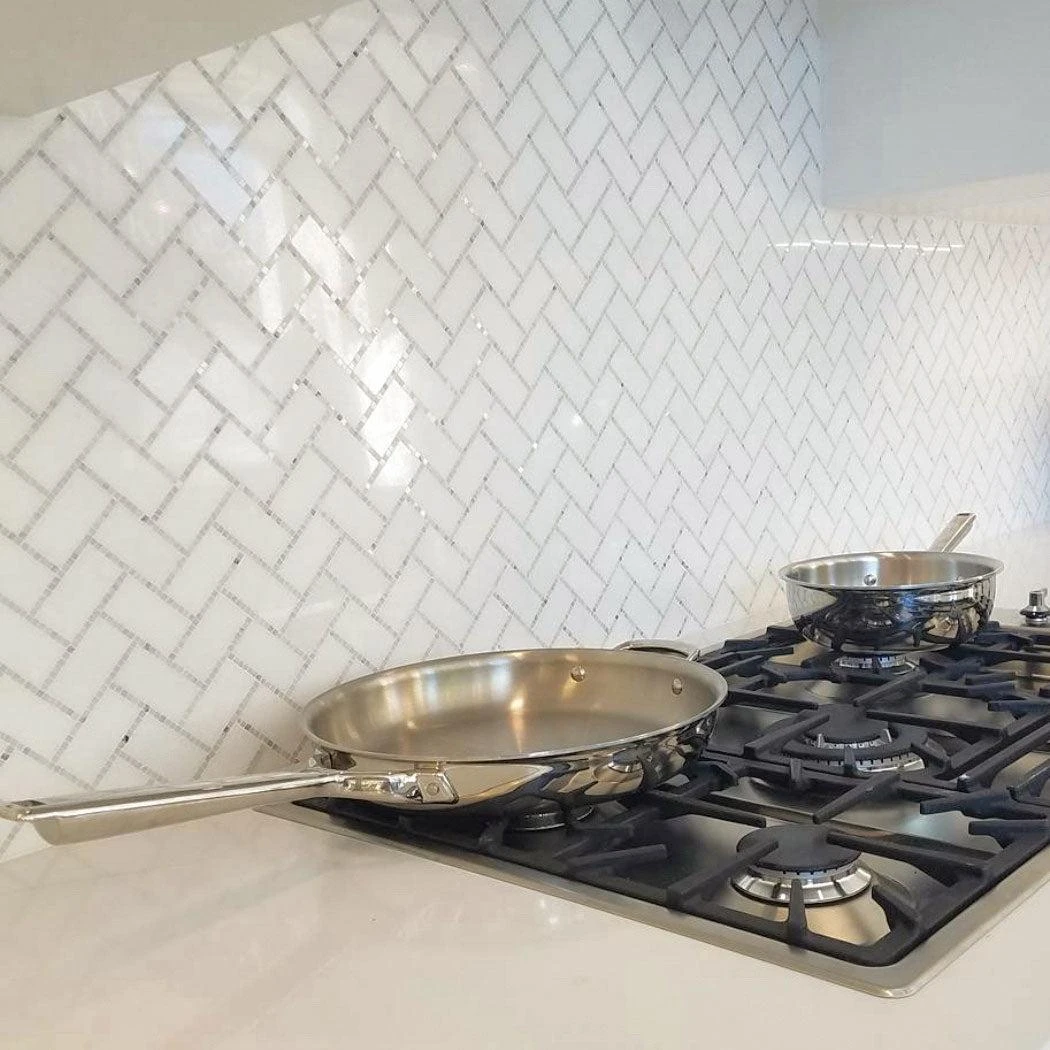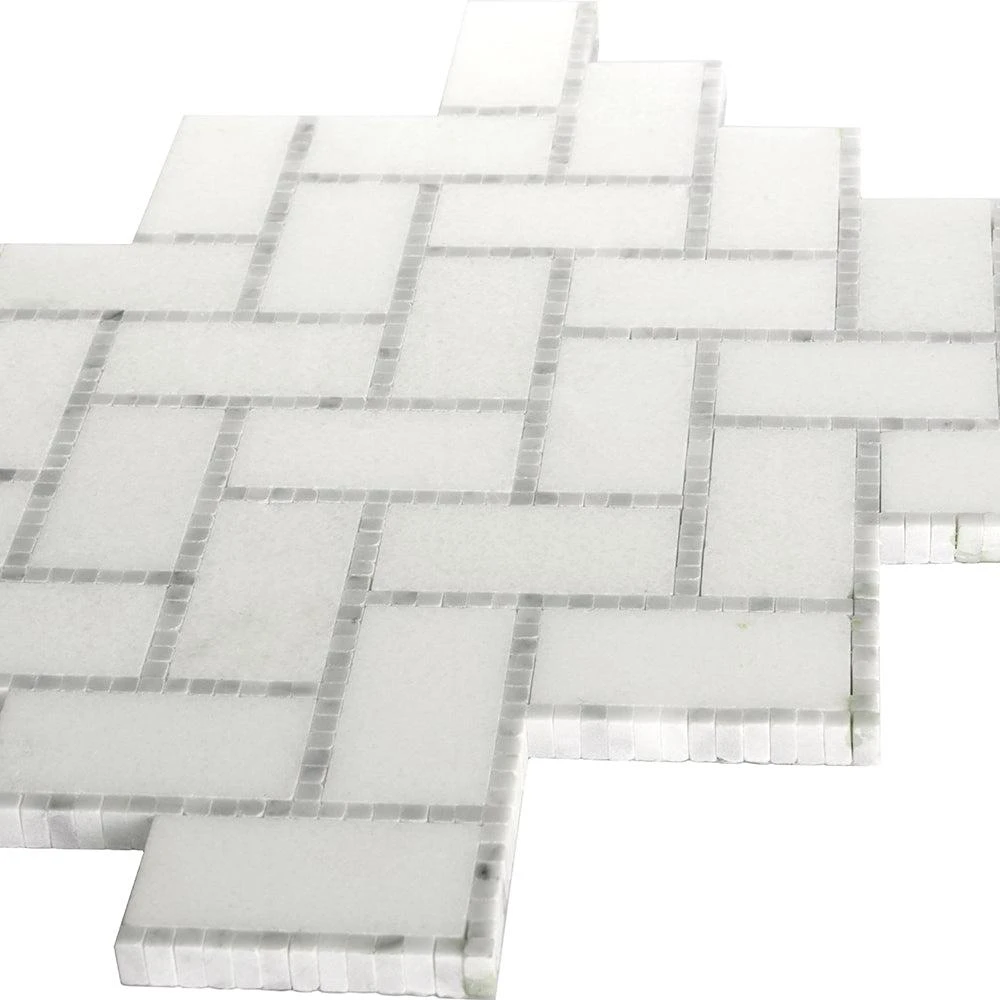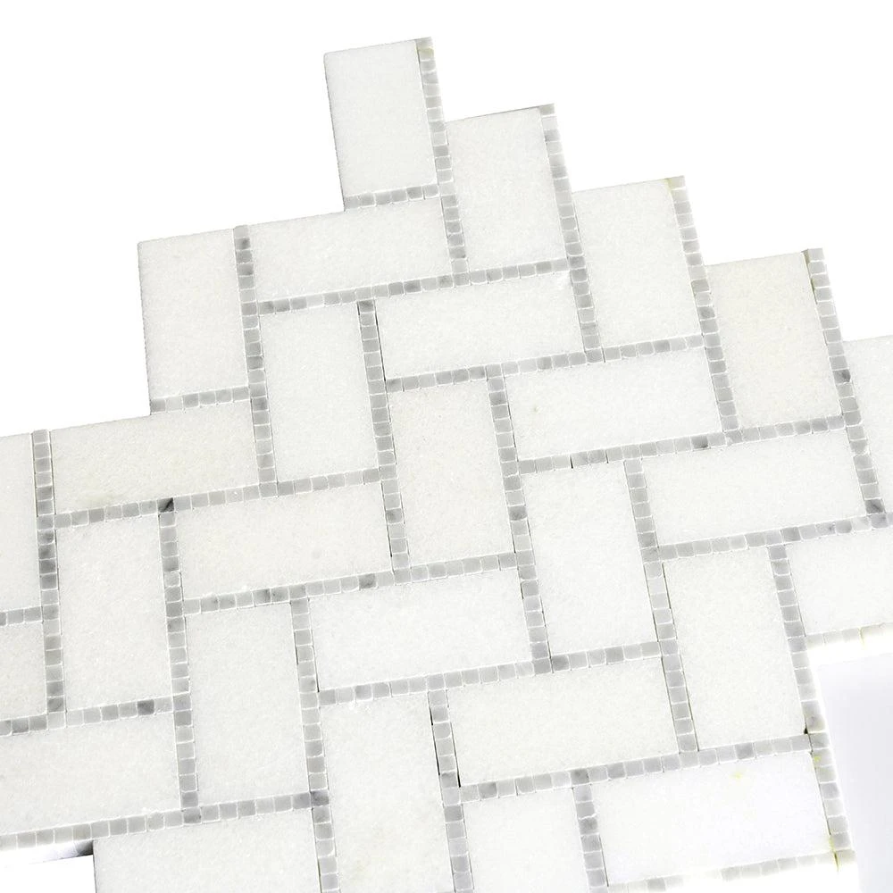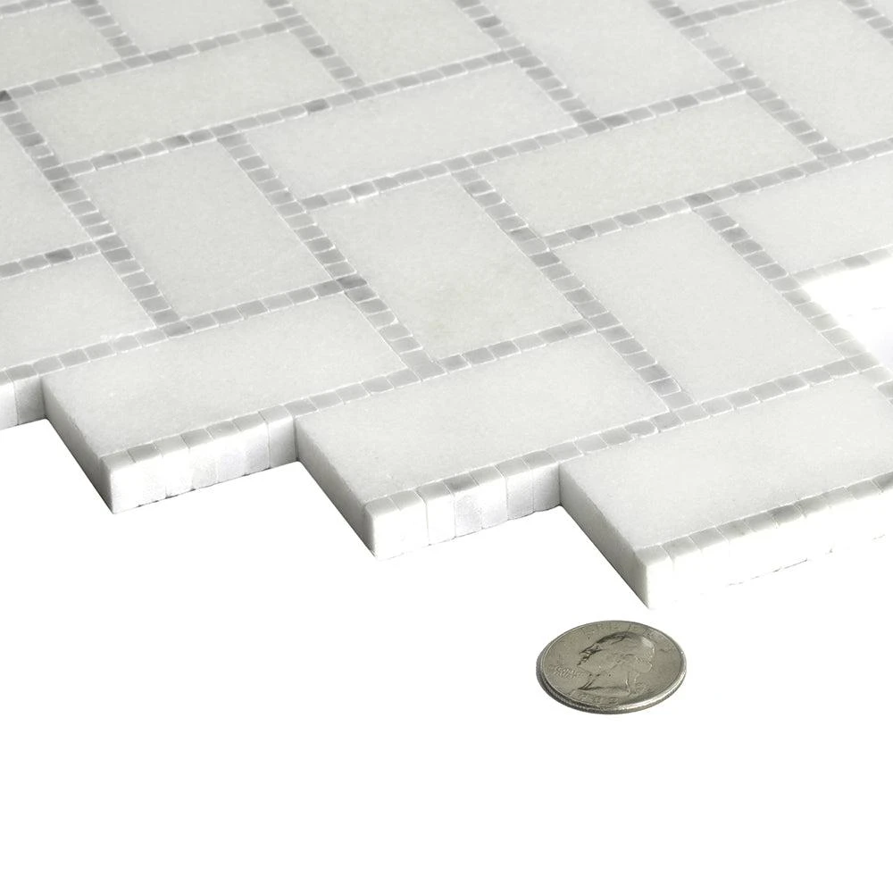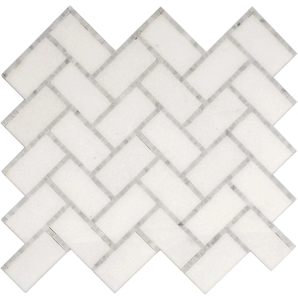 Update your décor with timeless marble tiles in this attractive herringbone pattern with an added mosaic detail! Our Lexington marble mosaic herringbone tile is a gorgeous element in any design with its blend of Eastern White and Bianco Carrara marble. White marble tiles feature smaller mosaic inserts in a darker shade within the herringbone pattern, creating extra movement on the surface. It is a great tile for a backsplash in your kitchen or bathroom, high and low traffic tile floors, and creative tile patterned walls. Bring an elegant touch to your home with these high-end marble tiles that will evoke a luxurious feel! Due to the nature of stone, variations in color, pattern and veining may occur