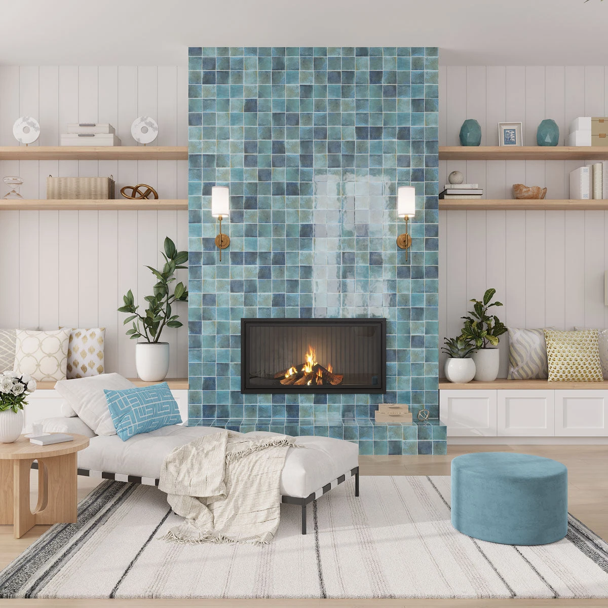 Create a completely custom design when you mix and match with our decorative 3D pieces in the Luna Arc collection. Add a textural accent with the occasional decorative piece! Lay out your tiles before applying your thinset to design a one-of-a-kind installation. The lovely shades of blue and green in these glossy tiles are a beautiful addition to a statement fireplace in the center of your living room.