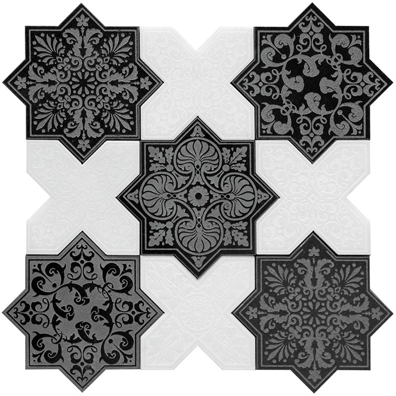 * Mix of Star and Cross tile colors will look as shown – etched patterns on individual tiles will vary. Also offered in the reverse color way with white stars and black crosses!