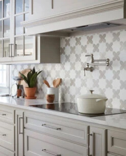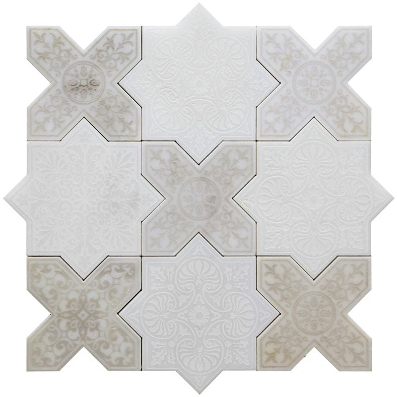Our best-selling Moroccan tiles in a star and cross pattern are now available in a beautiful mix of Antique Beige and white marble! These interlocking marble mosaic tiles come pre-mixed with white stars and Antique crosses to make it even easier to install a beautiful star and cross tiled backsplash design in an elegant neutral color scheme, an etched marble floor tile in a mixed color design that can complement any interior, or a stunning fireplace surround to add pattern and texture to your living room!