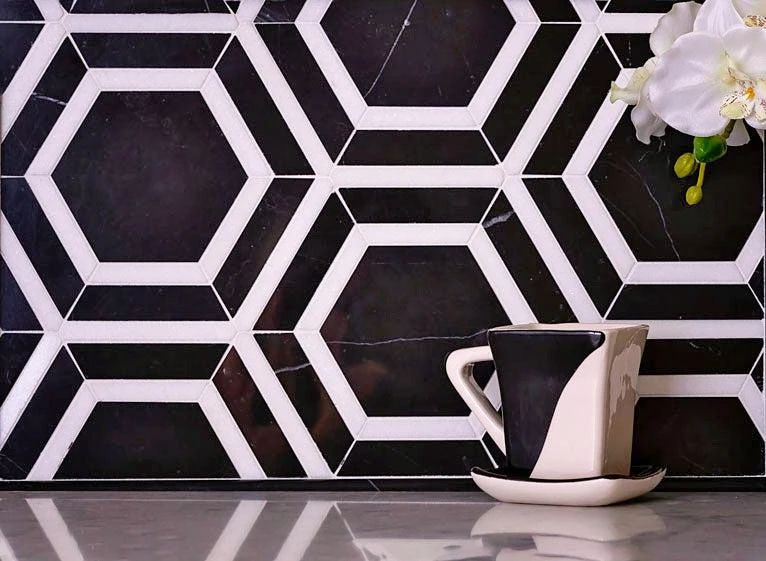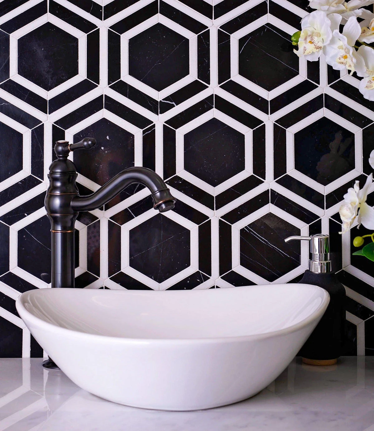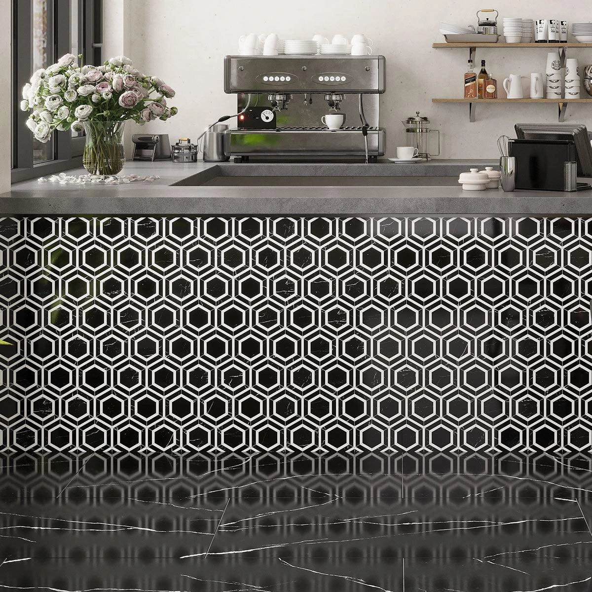 6” Nero Marquina hexagon tile is a contemporary update of the ever-classic hexagon shape. This monochrome, black and white tile is made of Nero Marquina and Thassos marble pieces that are beautifully arranged in an intricate hexagon pattern. Since black tile white tile exudes a timeless elegance, it can suit both contemporary and classic designs. Choosing a monochrome tile will also ensure a classical simplicity that will look elegant for the years to come. This black and white hexagon tile is an excellent choice for most interior and exterior installations where you want to achieve a geometric look. It is great for stunning tile flooring projects including your foyers, kitchens or bathrooms where you want to create a rug effect under your feet. Hexagon is not only suitable for tile flooring but can also make a cool statement for as a kitchen backsplash or shower tile where you want a unique monochrome design.