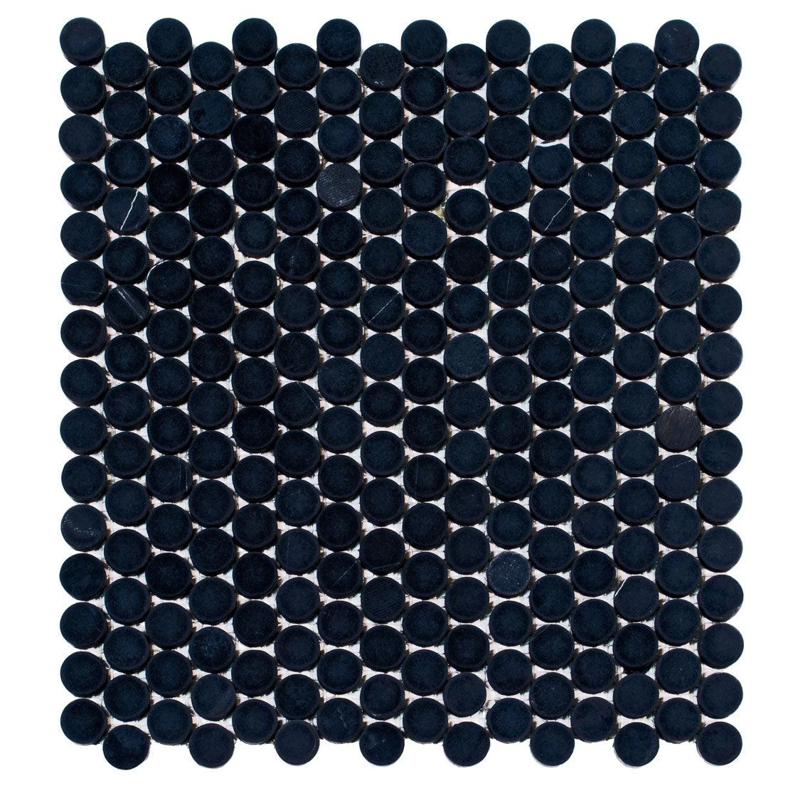 Add a touch of enduring elegance to your home with this dramatic black penny tile. This Nero Marquina penny tile is a timeless and classic addition to any space, especially for deluxe floors, baths, and showers. Made of black marble mined from the region of Marquina in northern Spain, Nero Marquina Penny mosaic tile is a contemporary reimagining of the ever-classic penny rounds. It is that rare combination of past decadence coupled with a modern color scheme of pure black with organic white veining.