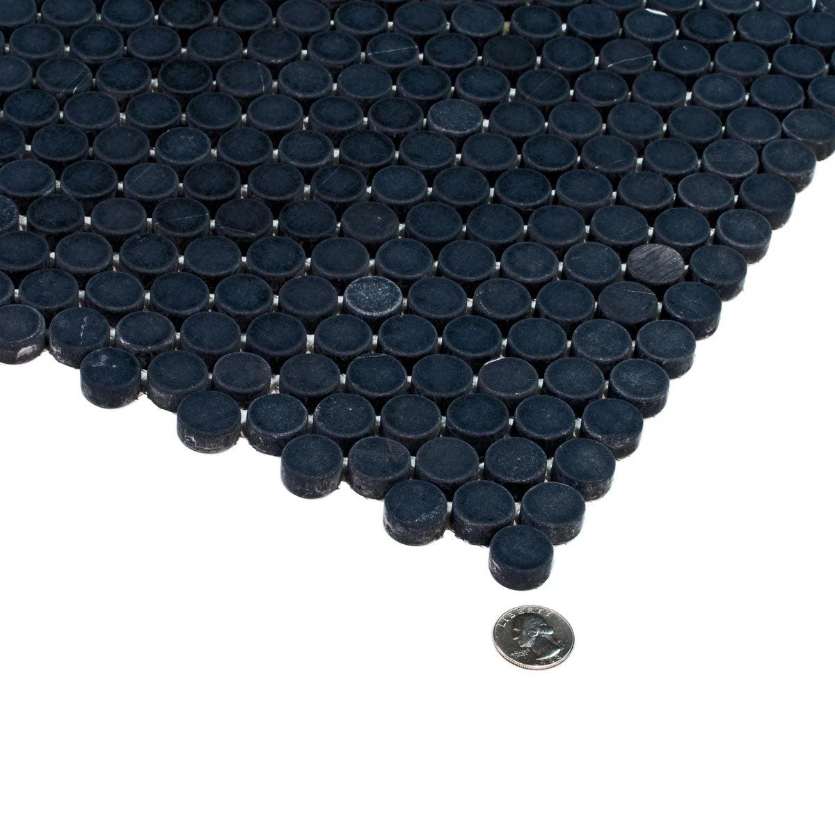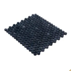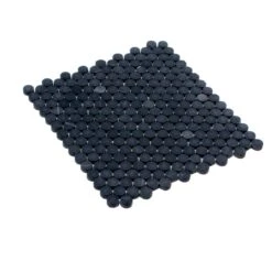 With Nero Marquina Penny mosaic tile, you can combine practicality with beauty. Whether you create tile flooring for your foyers or bathrooms, this tile is great at hiding dirt and stains. The black marble is also incredibly easy to clean while at the same time portraying the ultimate regal lifestyle (it’s a stunner for bathroom floors, not to mention slip-resistant). The pure stunning black marble also complements a white bathtub and sink creating an unforgettable moment and one you will greatly appreciate when you want to take a pamper day or have a long bath. You can use penny rounds not only for tile flooring but also as a beautiful tile backsplash for your kitchens and bathrooms. Due to the nature of the stone, variations in color, pattern, and veining may occur as part of the allure of this unique natural material.