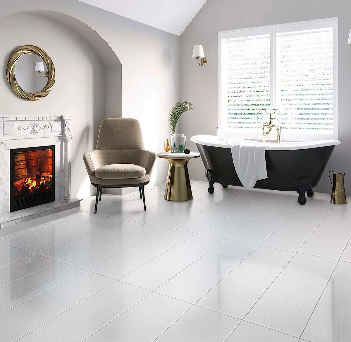 Dreaming of minimalist all-white home design? Our Neutral Blanco tile is a great choice! It delivers a simple seamless tile look that can refresh any residential or commercial space. Used with a matching grout this large format porcelain tile is an excellent solution if you want to visually maximize the area and bring a breezy feel. And if you use a contrasting grout, you will reach the dynamic, dramatic effect. Polished porcelain tile finish adds a slight gloss and completes the look. This product is great for wall applications, both indoors and outdoors. You can revamp your shower walls and enlarge your shower cabin, bring a clean look to your bathroom with a pure white backsplash. Decorate your patio, entrance, or hallway with this amazing snow-white tile. Or use it in the kitchen for a white porcelain tile backsplash that matches with your white kitchen cabinets.