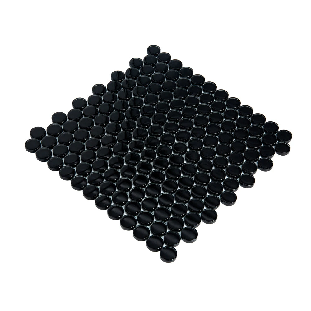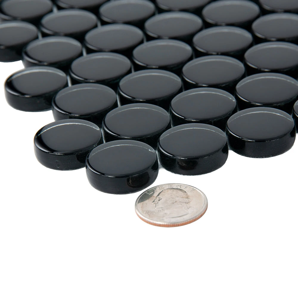 If you’re looking for a glamorous and effortless way to upgrade your kitchen backsplash, bathroom, or outdoor patio then the easiest way to do it is with our Obsidian black penny round glass tile. This glass penny tile design has a bold black look with a glossy surface. Shades of black lend themselves to both modernity and sophistication so this glass penny tile design is an easy pick to complement any space. Despite the glass surface, this tile can be used for both interior residential and high traffic flooring.