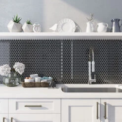 This obsidian black glass penny round tile is a lavish addition to any bathroom and goes very well with modern chrome or brushed nickel fixtures for an overall dapper vibe. It is perfect for an upscale bathroom with minimal additions because the black glass tiles give a stylish, attractive finish. Consider having an obsidian black tile bathroom especially if the space you’re working with is smaller and you think the black can add dimension and personality. Many people may prefer using this penny tile design in conjunction with other geometric mosaic tiles to add interest to a bathroom wall or central kitchen area. A penny backsplash in particular is a gorgeous way to utilize glass mosaic penny tiles because they can be easily maintained and add vibrancy and style to any kitchen setting. Wherever possible, contrast this stunning obsidian black with silver metals, matte decor, and the occasional addition of foliage and plants for a Zen vibe.