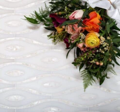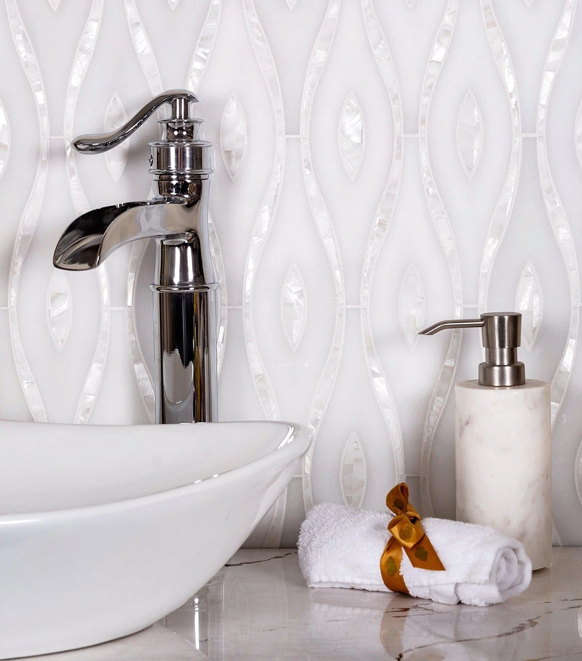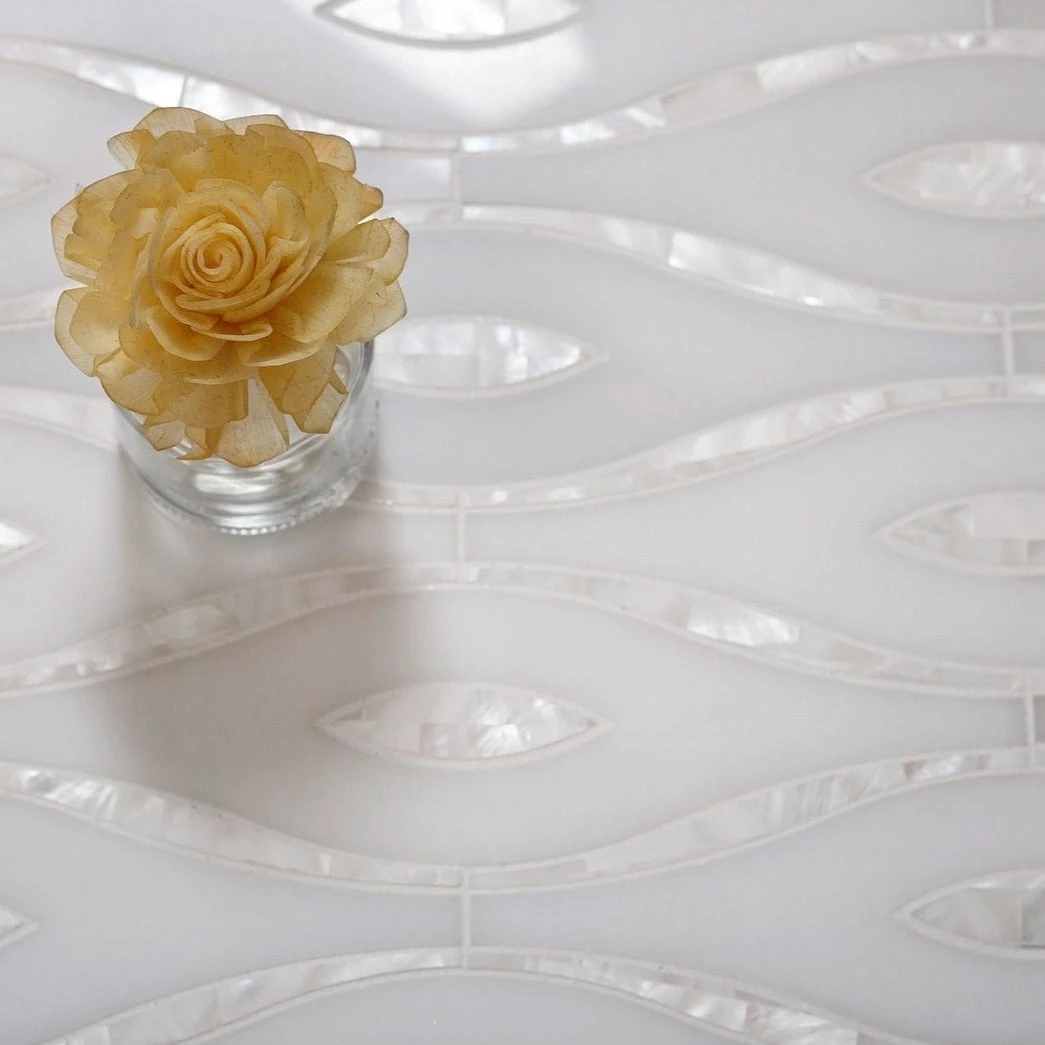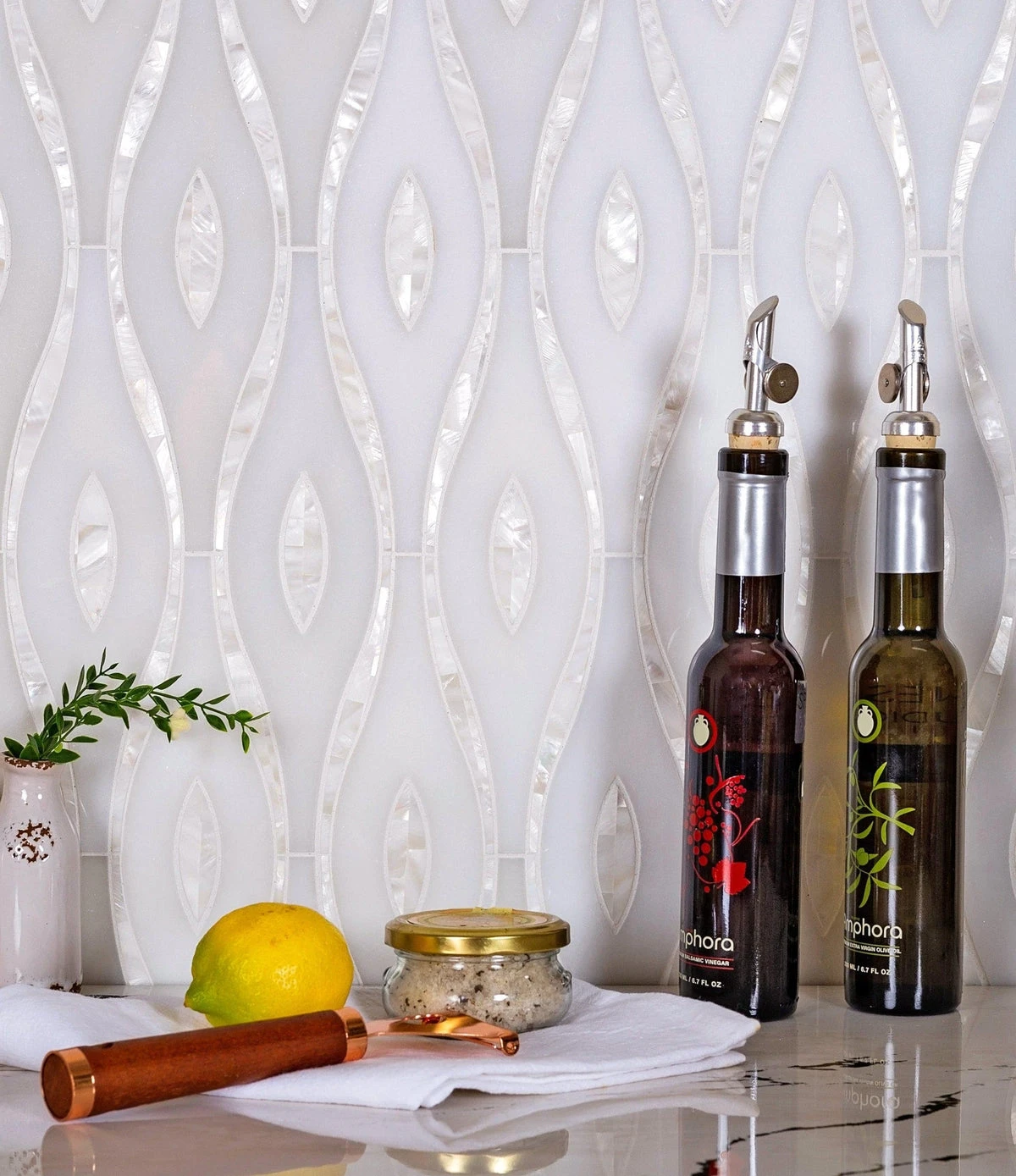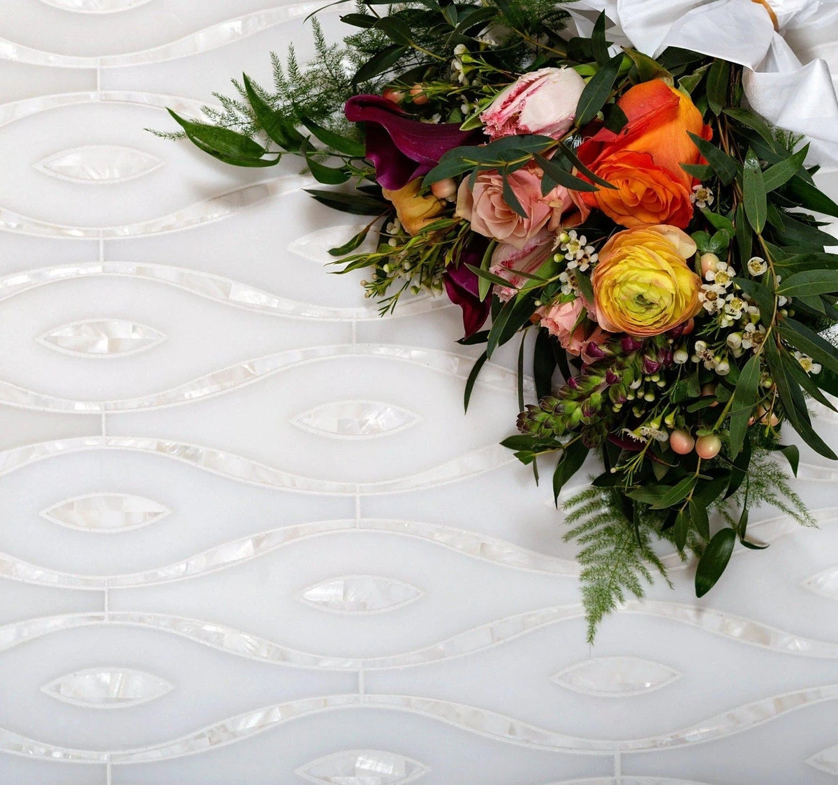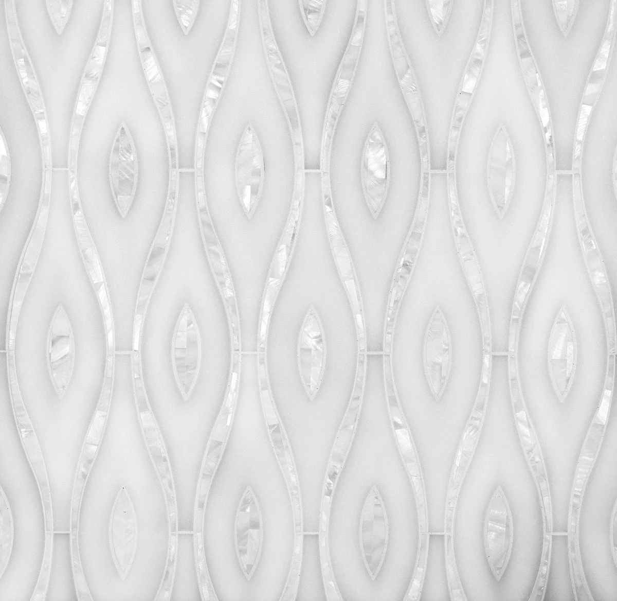 Transform your home design with our original Pearl Wave White Marble & Mother Of Pearl Waterjet Mosaic Tile. This waterjet tile was created to bring peaceful movement and graceful calm to your space. Inspired by the ocean, the gentle wave pattern of these shell tile pieces make a truly artistic statement. Composed of paper white marble and pearl, this durable tile will grace your house for years. These mosaic tiles form a continuous pattern and are interlocked together for fast and easy installation. The durability of the materials allows this marble tile to be installed on a huge variety of projects, including residential floors, shower walls, bathroom, and kitchen backsplashes. Make a luxurious feature wall or a modernized beachy backsplash, and turn this mosaic tile into a stunning piece of art.