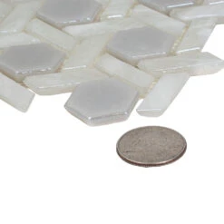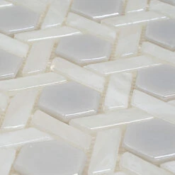 A unique look of this mosaic is formed by a harmony of color, texture, and a combination of different shapes. Hexagon-shaped tile pieces are infused into a whimsical weave pattern to build a strong artistic statement while white glass creates a clean, light appeal. Glossy finish brings up a pearl tile effect and adds a radiant flair to your ambiance. Square tile form and a mesh mount provide simple and quick installations. It is suitable for a wide array of installations. Use it indoors for your bathroom, kitchen, foyer, or laundry room to create a geometric backsplash, a textured wall, or an eye-catching tiled floor. Use it for an accent piece or for the entire surface application. Beyond that, is great for any outdoor tile ideas like patios or decks. Due to sustainability, low maintenance, and slip resistance of glass, it is a perfect shower, steam room, spa, and swimming pool tile.