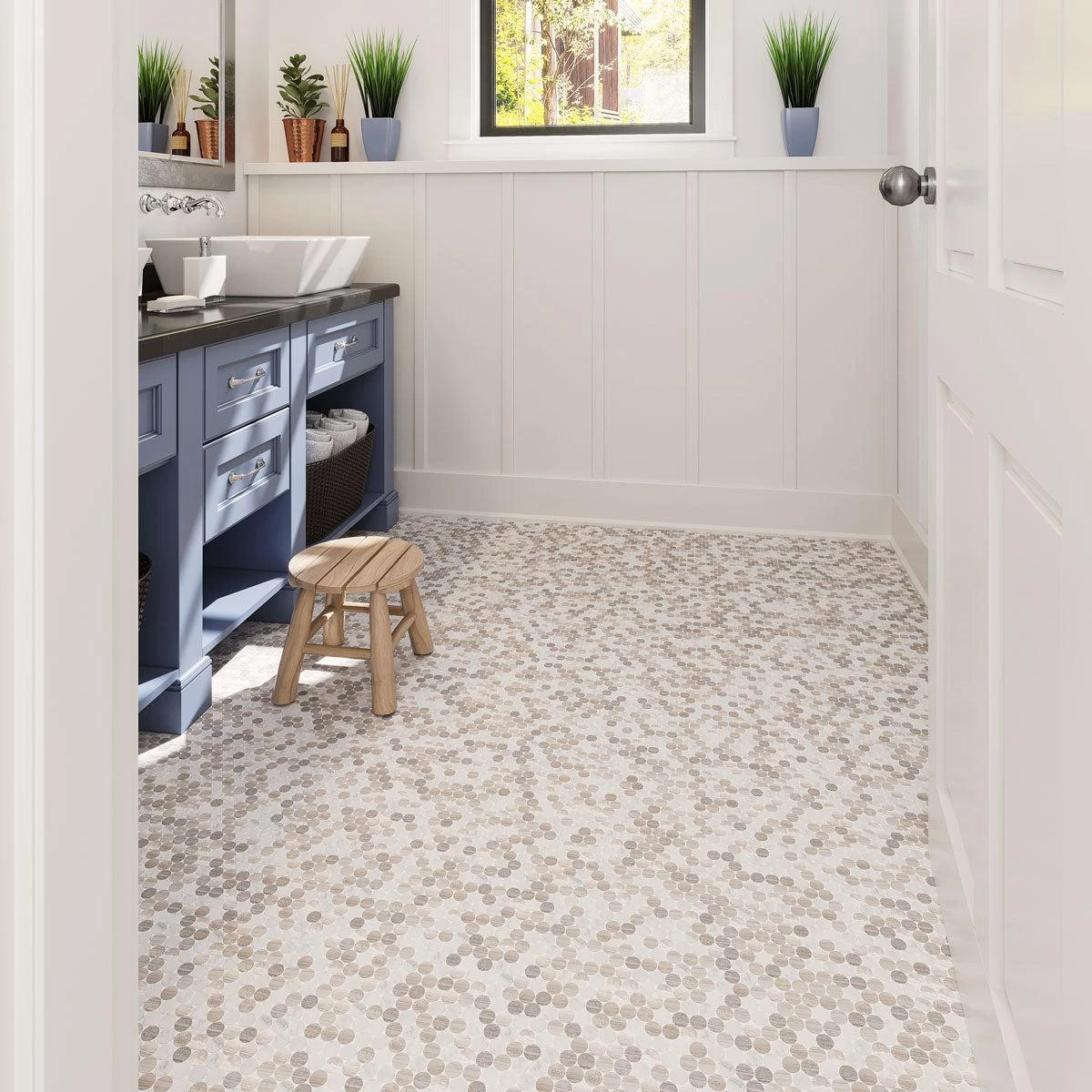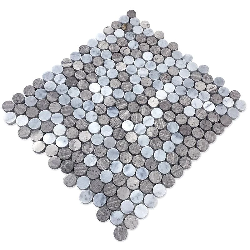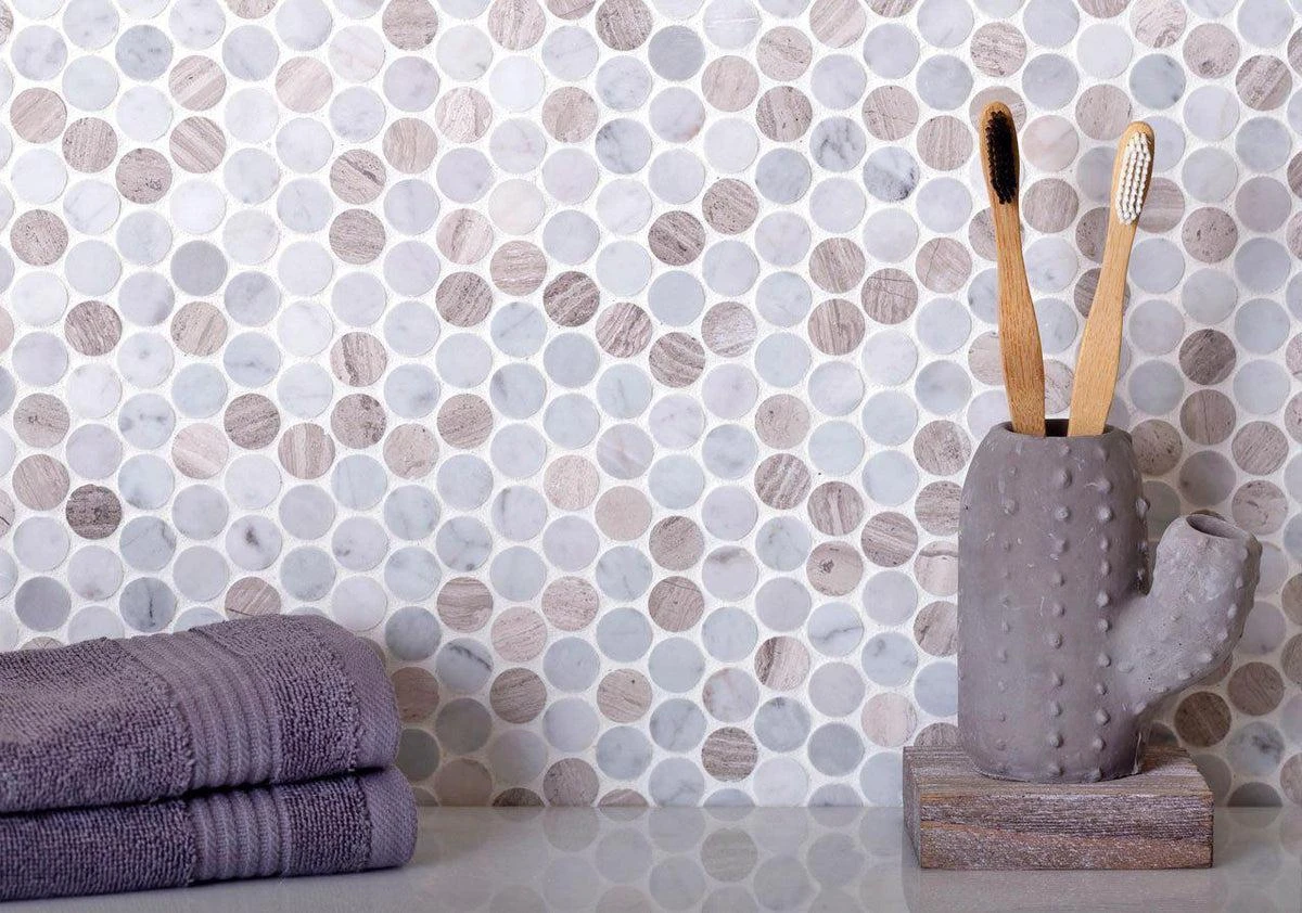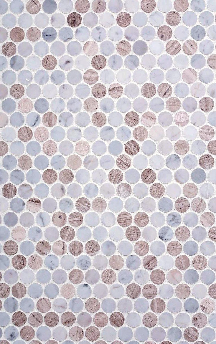 It doesn’t get any more classic than a round penny tile in our Wooden Grey and Eastern White marble. Natural variations in the wooden beige marble tile give these penny tiles an organic feel that creates an opulent backdrop wherever they’re used – from a warm and inviting kitchen backsplash to a timeless shower with penny wooden floor tiles and wall tiles!