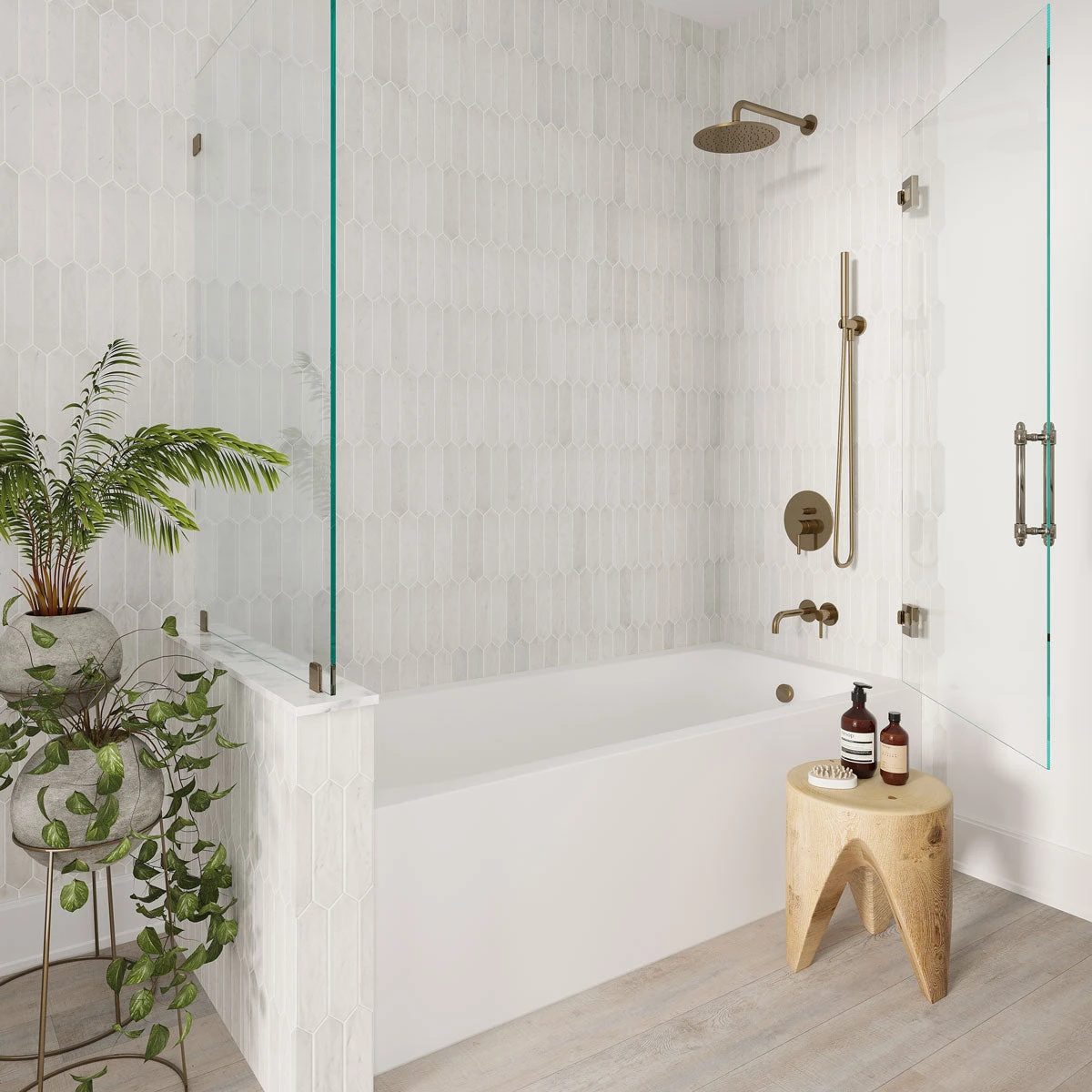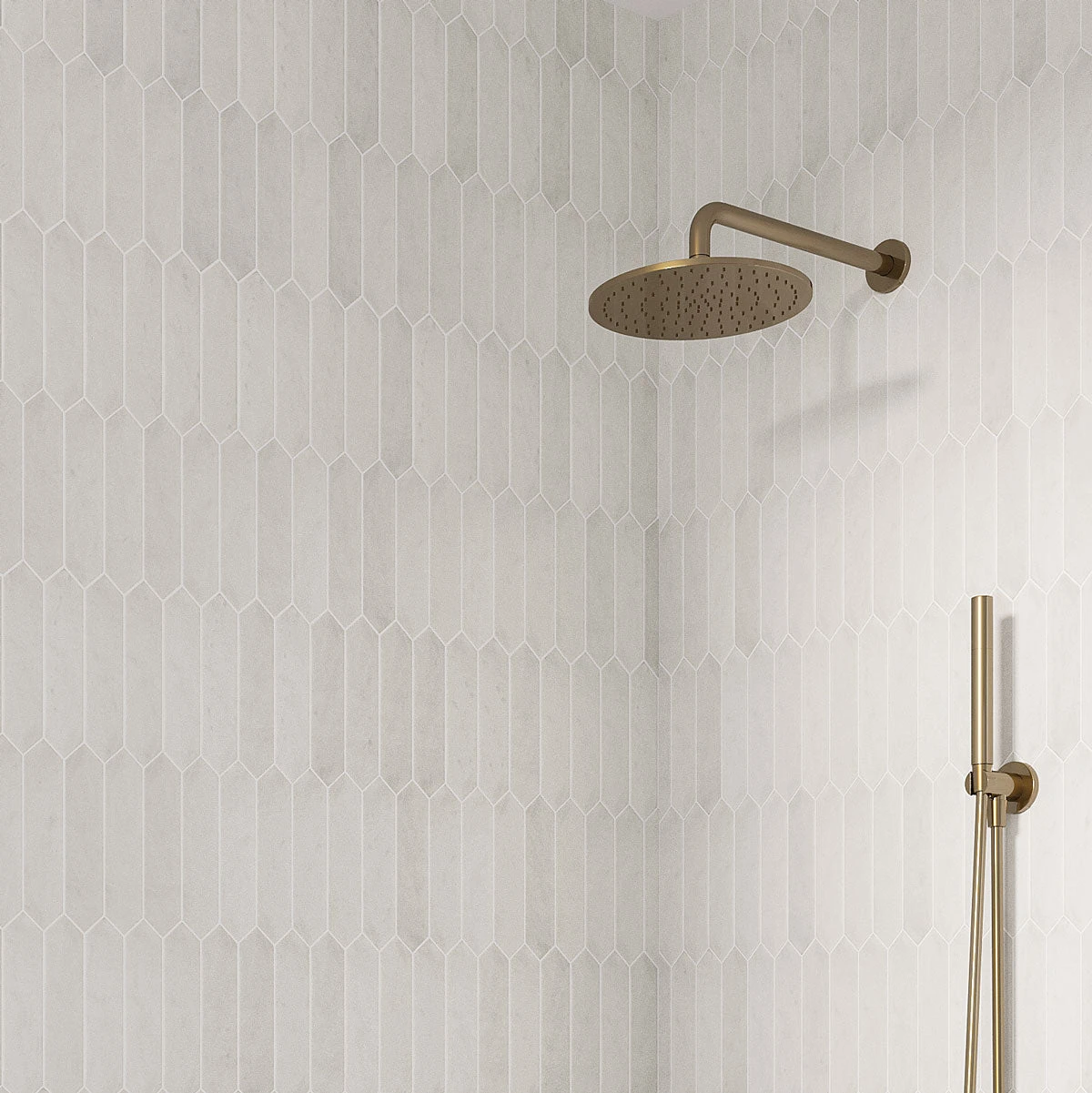 *The install image shows a mix of Picchetto Pearl Gloss and Matte finishes. To recreate this look in your own home, boxes of both finishes can be ordered and mixed together during the installation process. Tile Club recommends laying out your matte and glossy picket tiles prior to applying your adhesive to make sure you are happy with your custom mix before adhering the tiles! See more design options in the Picchetto Ceramic Picket collection!