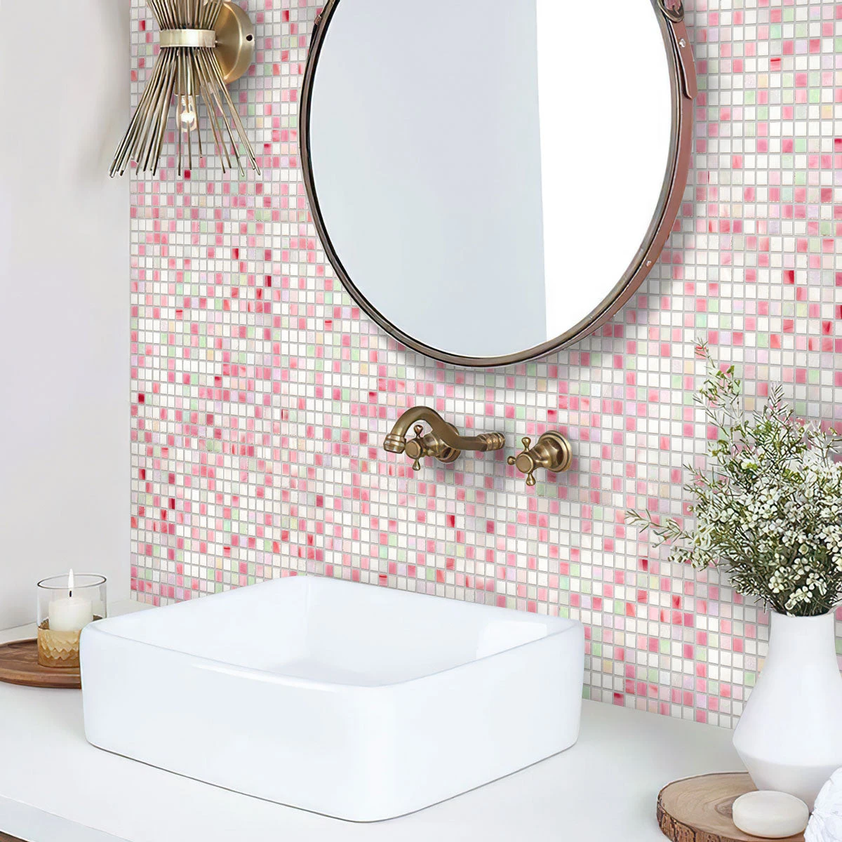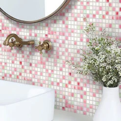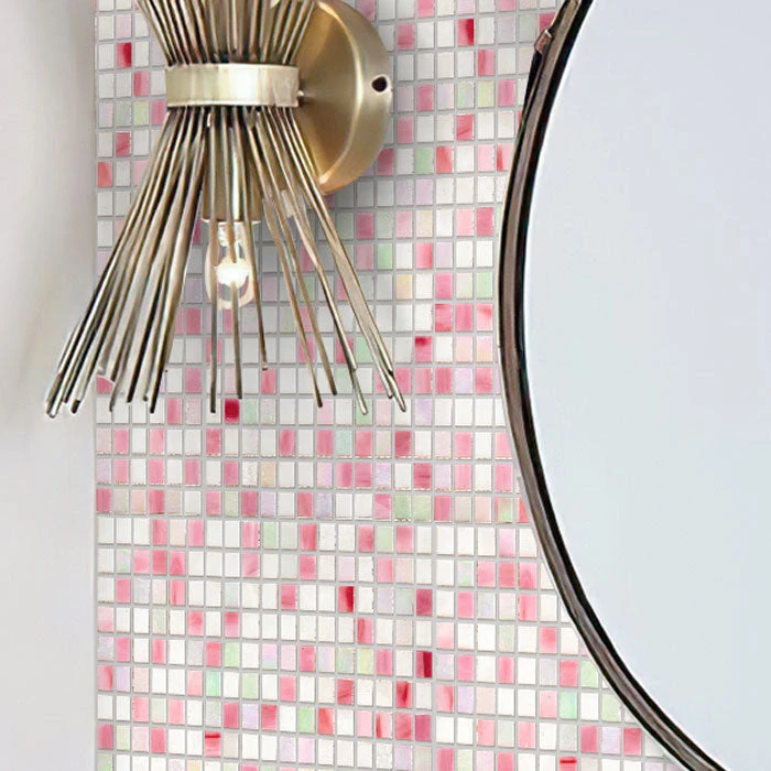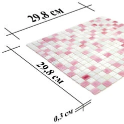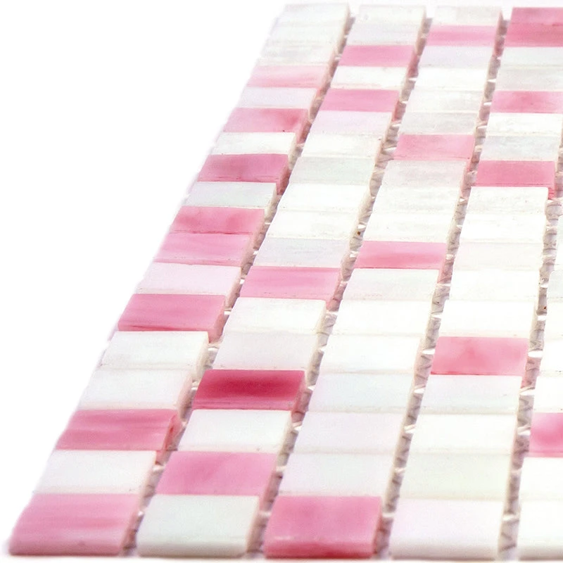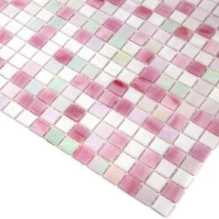 | Sold by: sheet Sheet Size: 11.6″ x 11.6″ Chip Size: 0.6×0.6″ Thickness: 1/4″ Mounting: Paper Facing Material: Glass Color: White, Pink Recommended Adhesive: Laticrete Glass Tile Adhesive Lite Packing info: