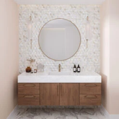 The design inspirations are limitless with these mesmerizing hexagonal mosaic tiles. Pair them with shiny fixtures in bathrooms to create a harmonious symphony of light and reflection, or utilize them as a modern and easy-to-clean backsplash in kitchens, where spills and splashes are effortlessly handled with style. By harnessing the power of light reflection, these glass tiles will create mesmerizing dimensions in small spaces including narrow bathrooms, small showers, powder rooms and entryways.
