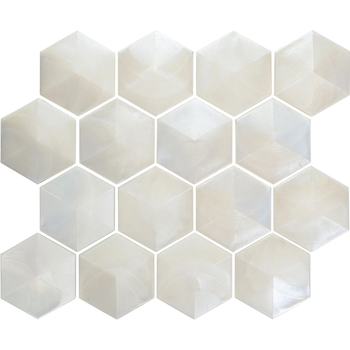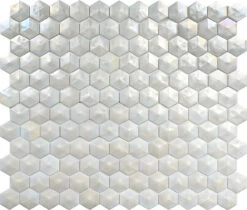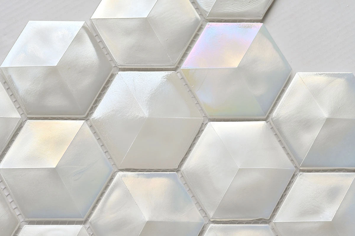 Our Prism Pearl Beveled Hexagon Glass Mosaic tile offers a fresh twist on the traditional honeycomb tile with their 3D design and luminous white palette! These 3D tiles bring a sparkle like no other, which makes them the perfect choice for updating your surfaces with a radiant shine. Prepare to be captivated with a dimensional tile design using these pearl-white mosaics on any interior wall!