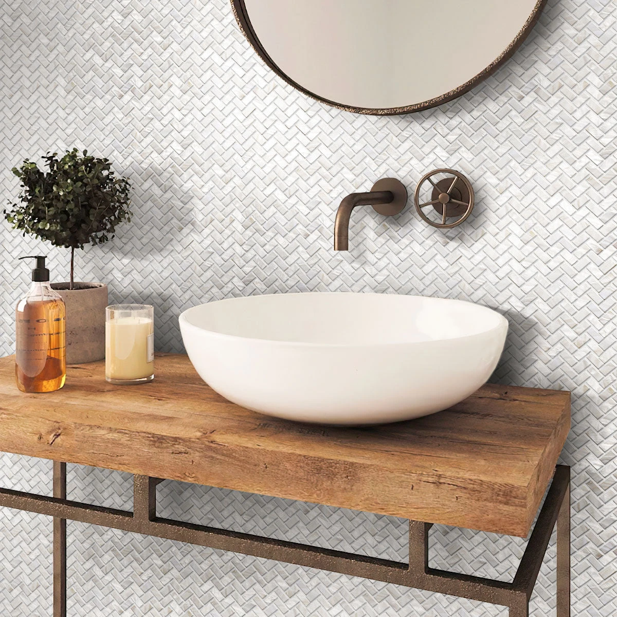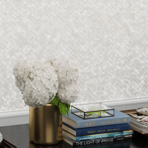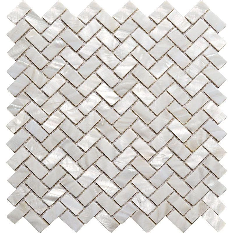Welcome an exquisite mix of luxurious material and a classic herringbone tile pattern. Traditional shape and neutral white mosaic color can highlight any design. A gentle sheen of a natural shell tile creates volume and space perfect for small areas. A unique pearl texture brings up a warm comfortable coastal feel. Each rectangular tile is mounted on a mesh backing for quick problem-free installations. Seashell is an excellent eco-friendly, long-lasting, durable material suitable for many design ideas. It is a great solution to cover low traffic floors or walls and spice up a boring one-tone design with a dynamic, but not demanding white backsplash, feature wall, or a fireplace surround. A grid of grout lines makes it slip-resistant and perfect for bathroom floor tiles as well. This white Mother of Pearl tile is an ideal match for modern minimalist kitchens, bathrooms, dining rooms, living rooms, or other interiors.