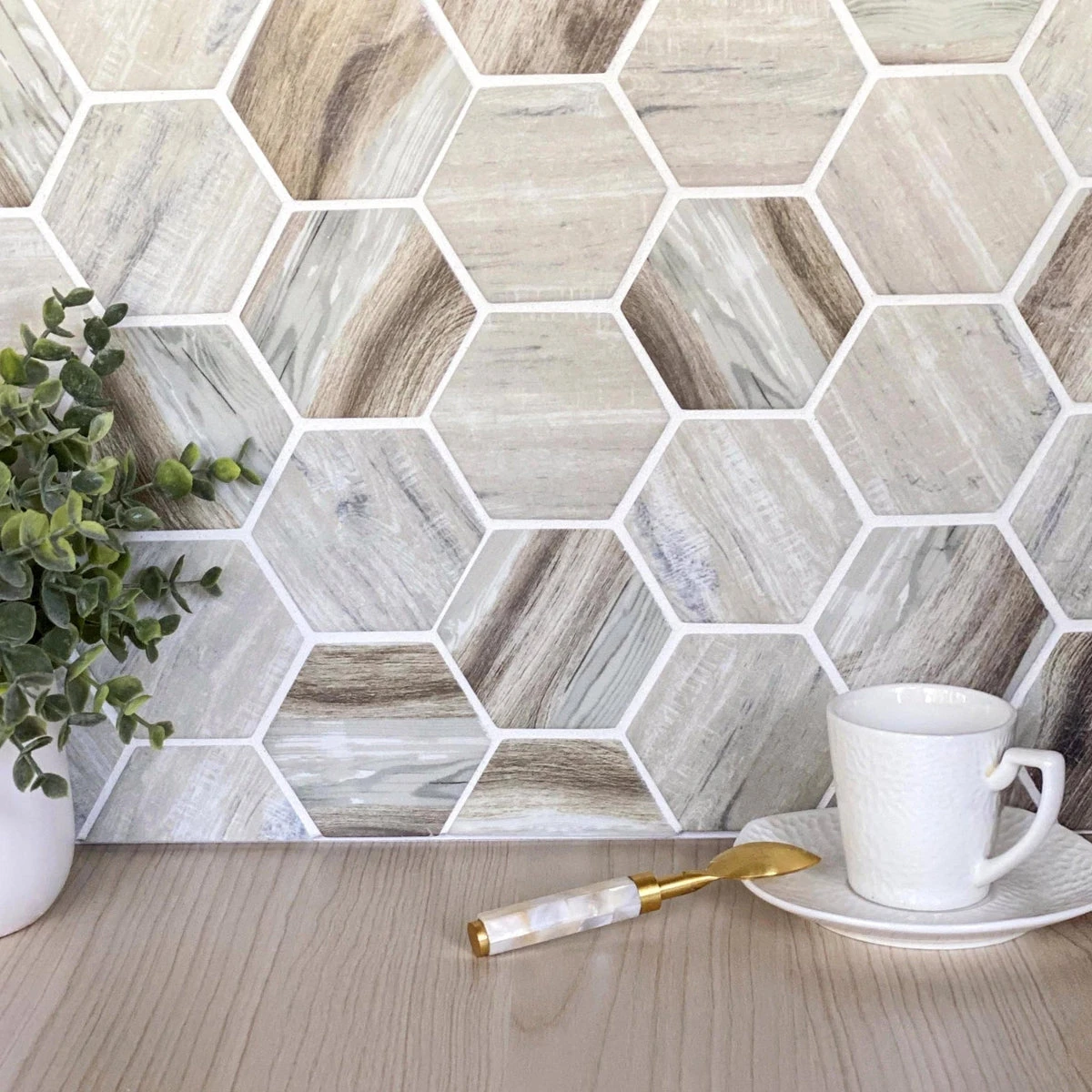 If you’re looking to add a fresh, organic look to your kitchen, our recycled glass backsplash is easy to install and one of the most beautiful recycled building materials for elegant and classic home design. These beige recycled glass tiles have a matte finish suitable for high-traffic areas and wet rooms. Because hexagon shaped tiles are a classic look, these glass mosaic tiles are an excellent choice for traditional or modern home design.