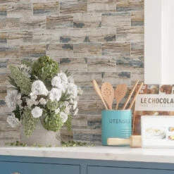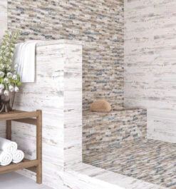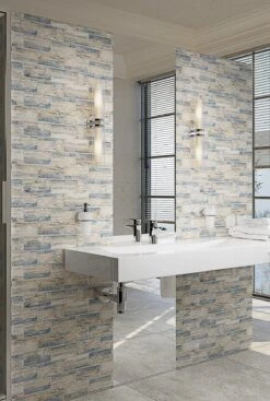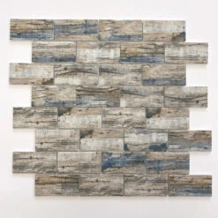 Use wood-looking recycled glass tiles to update your space and bring a natural wood feeling with a nonporous surface. This tan and blue recycled glass mosaic tiles allows you to have the beauty of wood-look tiles with an easy-to-clean glass surface, and thanks to the use of recycled glass, is a great way to incorporate eco-friendly and sustainable building materials into your home! Subway tile is a popular and timeless look in kitchens and bathrooms due to its versatility and timeless look. While it gives a clean backdrop for your home design to shine, it allows other design elements to take center stage. This mosaic tile has beige and blue color subway tiles laid on a mesh for easy installation. It can be applied in almost any area including your interior and exterior spaces! The durability of glass tile makes it a perfect choice for all wall applications, especially areas that might be exposed to water so don’t look further for a blue tile backsplash! The most popular use of this tile is backsplash for kitchens or shower walls as it is easy to clean while creating a beautiful aesthetic finish with natural tones!