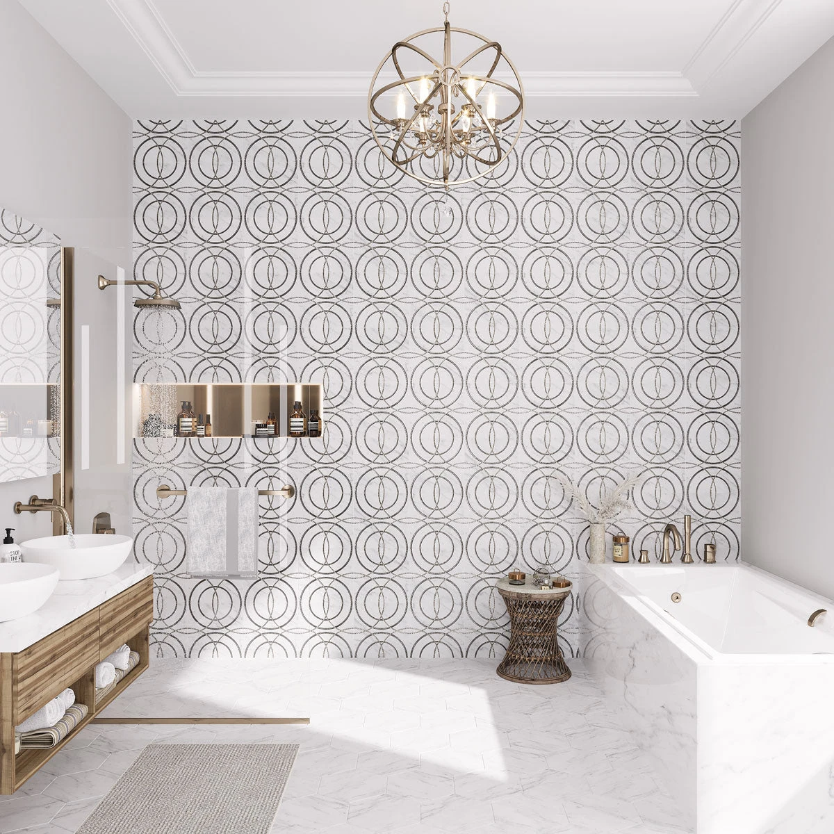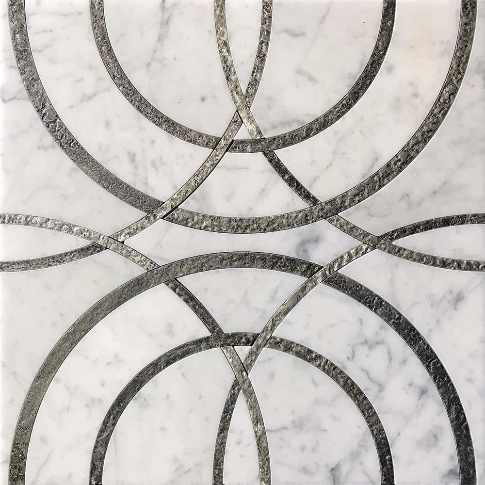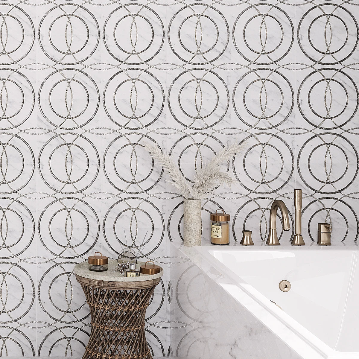 | Highlight your home with our incredible Roman Circles waterjet tile! This high-quality natural stone tile is generously decorated with silver lines that create geometric circle designs for a unique finish. Charming Carrara marble pairs with a shiny metal pattern to achieve a rich, luxurious look. This mosaic tile is an artistic statement meant to revamp and embellish any space with its creative style. This product is made in 12×12’’ square tile sheets with a continuous pattern for a fast and easy installation process. Roman Circles mosaic tiles is a beautiful accent to any interior design. It is a perfect tile for an elegant decorative wall or a kitchen backsplash. Roman Circles is a great choice for residential flooring if you are looking for a unique white marble floor tile. *Natural stone tiles, including marble, may display variations in color, finish, strength, and slip resistance. White marble may contain naturally occurring iron deposits that can lead to discoloration if used in areas prone to wet or damp, or if exposed to harsh chemical cleaners. As this is an inherent feature of the material, Tile Club does not assume responsibility for discoloration of marble or other natural stone tiles. To ensure you enjoy your white marble tiles for years to come, we recommend installing them in areas that are not prone to standing water, and regularly sealing your tile and grout. |
