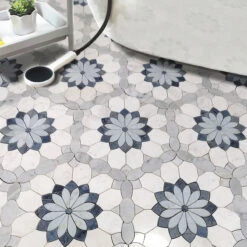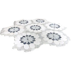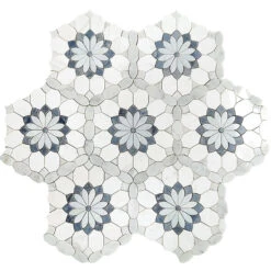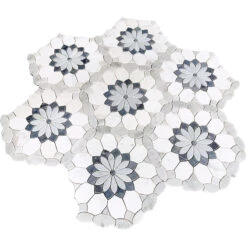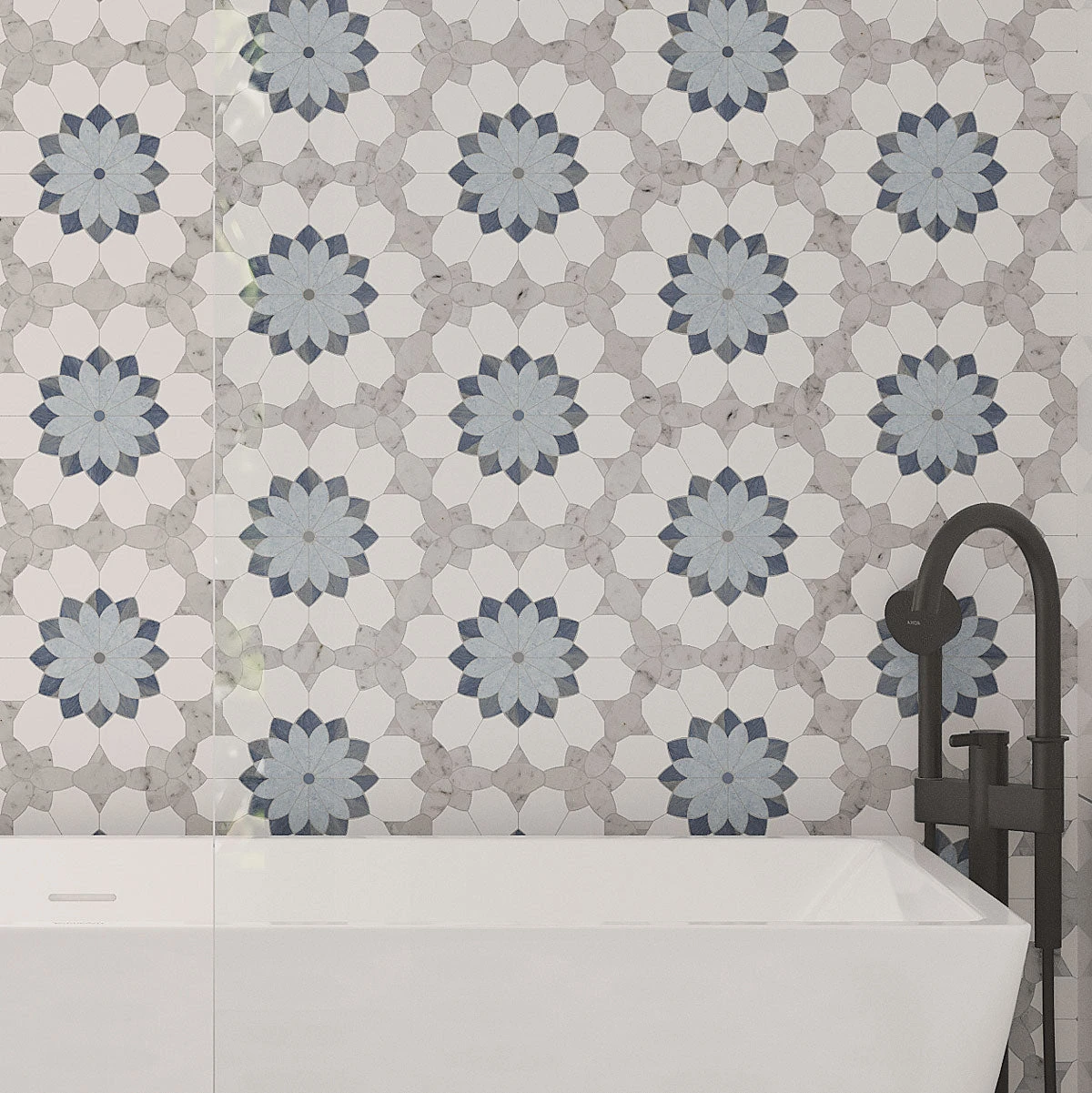 The lovely pattern of these marble mosaic tiles adds an enticing appearance wherever installed. The white, blue and gray palette creates an appealing visual with the benefit of a stunning and durable material. Timeless marble can fit many interior designs from classic to contemporary, modern or glamorous.