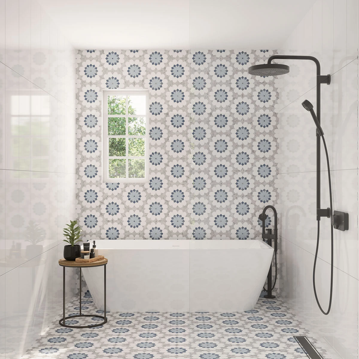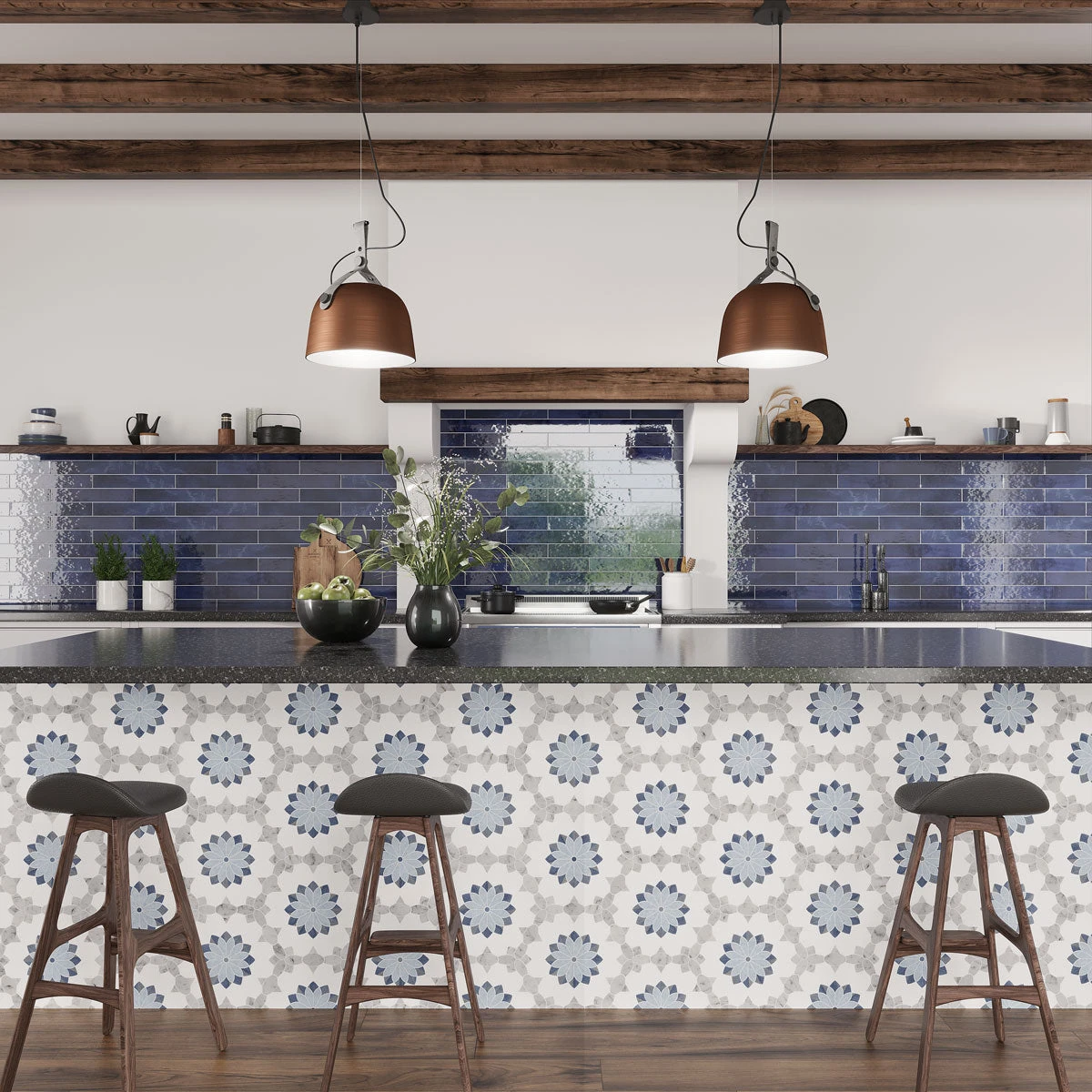 Were you thinking of choosing a floral wallpaper? Opt for floral wall tiles instead for an accent wall or vanity surround, to create a stopping feature that can withstand water and stains. The light color palette of this mosaic will help enlarge small spaces such as powder rooms or dark kitchens. These tiles are suitable for a variety of indoor applications including bars, shower floors, entryways, and even laundry rooms. Pair with gold accents and fixtures for an enviable design, worthy of a home-design magazine!
