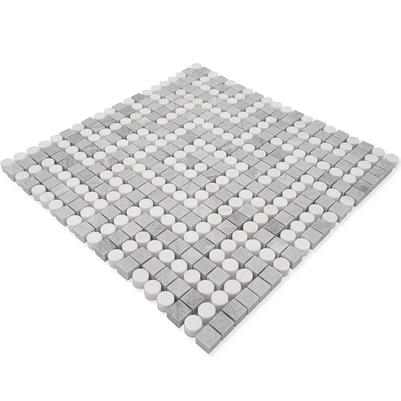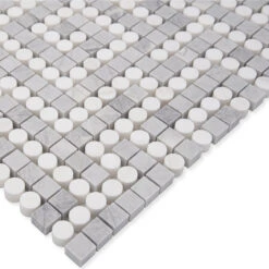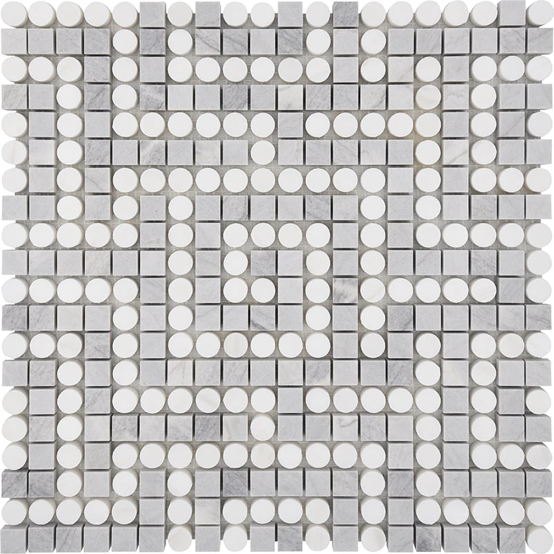 Lais Gray marble in square shapes creates a sweet contrast to Dolomite white penny round tiles which allows the geometric layout to stand out.
