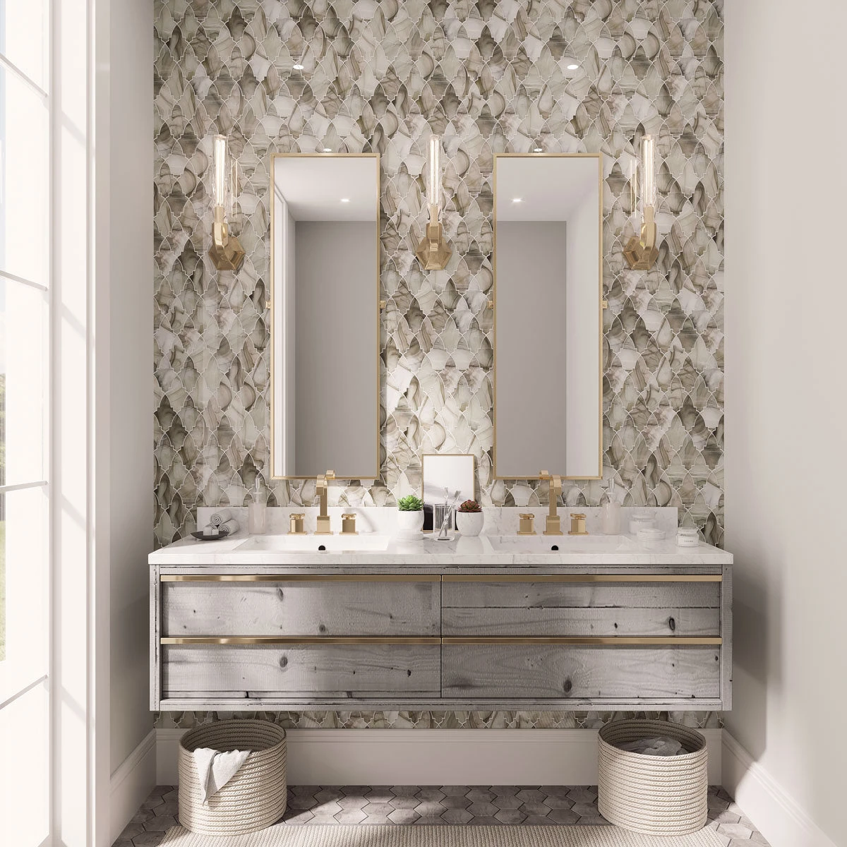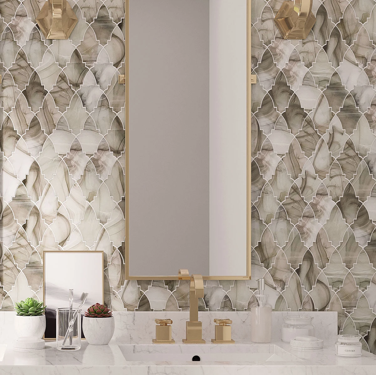 The name says it all – these stunning glass mosaic tiles are inspired by the beauty of the Sea. The amber and white color scheme are soft and calming, while the tint of each mosaic tile is reminiscent of tropical island sands. Combined together, they make for a stunning yet low-key look that’s sure to be popular in any season. This polished tile is great for use especially on walls in bedrooms, bathrooms, kitchen backsplash areas or other accent walls.