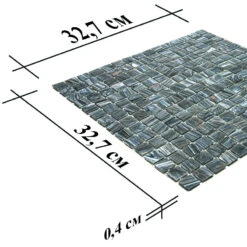 | Sold by: Sheet Sheet Size: 12” x 12″ Thickness: 1/4″ Chip size: 20 x 20 mm Mounting: Paper Facing Material: Glass Color: Blue and Grey Tones Recommended Adhesive: Laticrete Glass Tile Adhesive Lite Packing info: