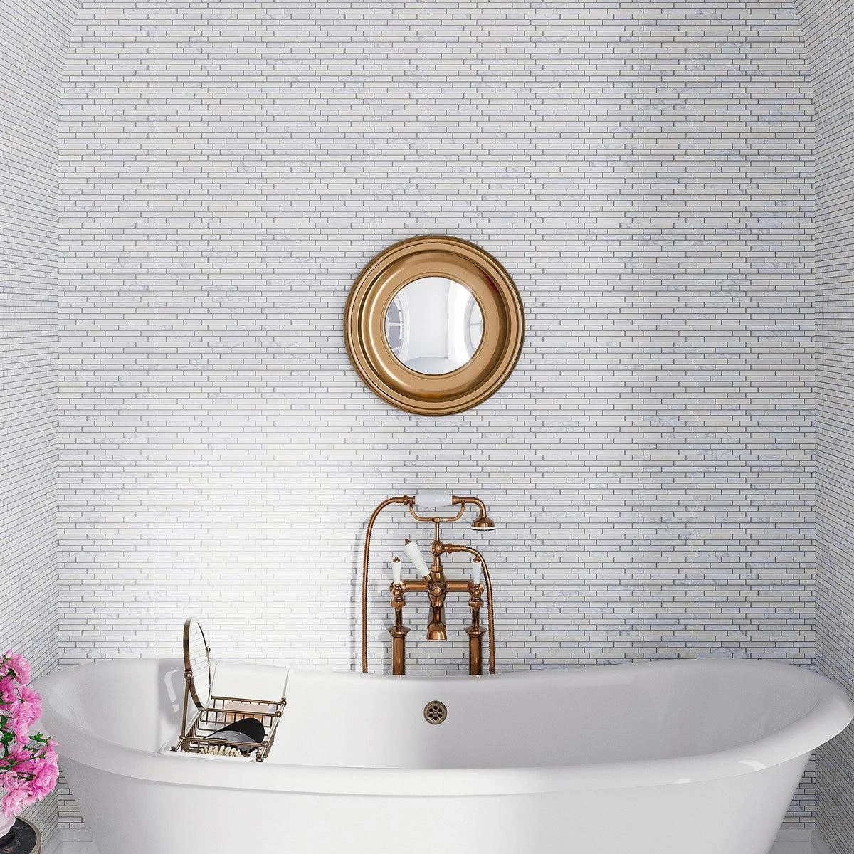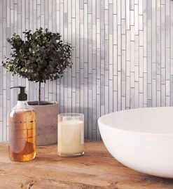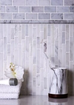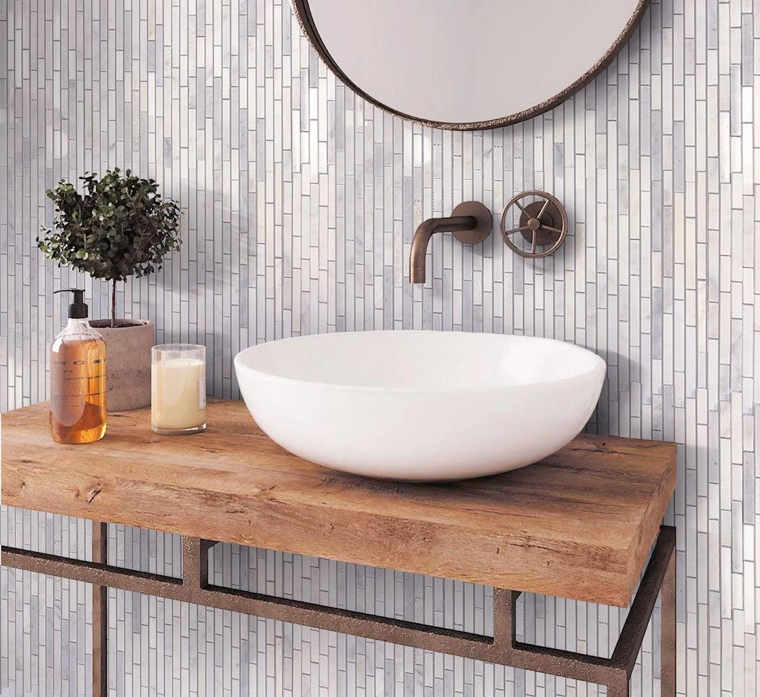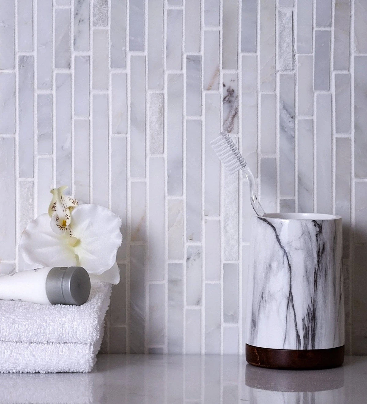 Eastern white tile pieces are laid on neat rows to create this simple yet classically chic Skyline tile. Stones are cut in various sizes as rectangular pieces and laid randomly in a linear pattern on the mesh. This linear marble tile adds a classy feeling to its surroundings with its bright white tone and natural texture. The white color with soft grey veining within the tile is versatile enough to create a timeless décor. This marble tile can be a great backsplash in a kitchen with almost any color. Linear mosaics are also a good choice for an accent strip that can run through your backsplash mixed with other materials and colors. Our Skyline marble mosaic tile can go on almost any surface including but not limited to the outside and inside walls, floors, fireplace surrounds, and statement walls.