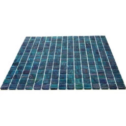 | Sold by: Sheet Sheet Size: 12” x 12″ Thickness: 1/4″ Chip size: 20 x 20 mm Mounting: Paper Facing Material: Glass Color: Teal with shimmer Recommended Adhesive: Laticrete Glass Tile Adhesive Lite Packing info: