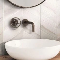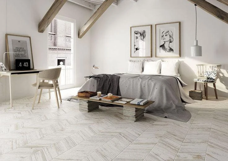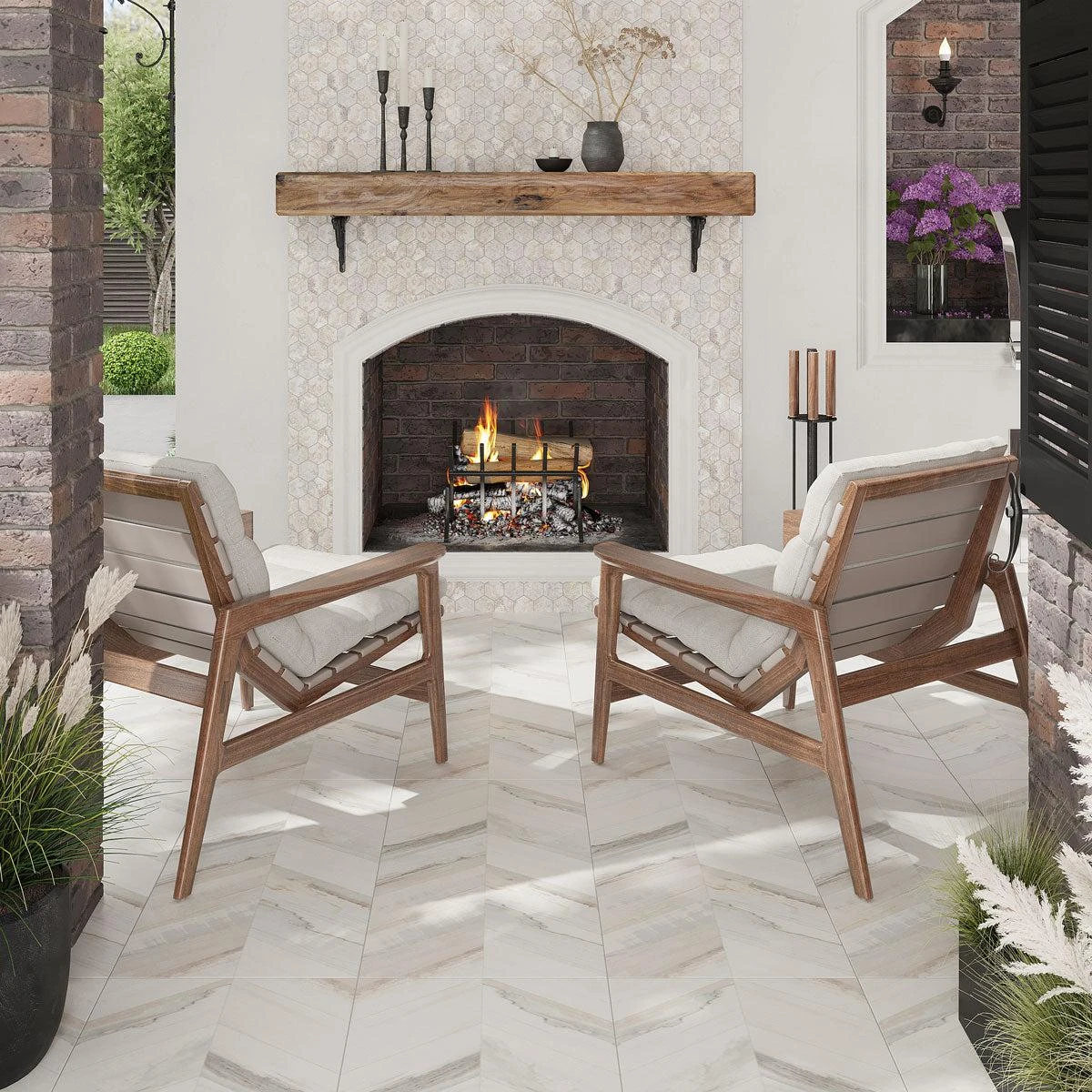Our Spiga Olson Blanco porcelain tile pairs high-quality of material together with a soft distressed look. The authenticity of a white washed wood texture reflects a popular Scandinavian design and delivers a soothing, cozy feel to any residential or commercial project. The color is a stunning alternative for white oak hardwood floor without being prone to scratches or high maintenance. This wood look tile for floors and walls can fit any interior style, from a cozy cottage home to a modern industrial loft. An ever-popular chevron tile floor pattern adds an exciting dynamic to enliven any setting. This product is applicable both indoors and outdoors. Use this porcelain tile for outdoor patio, deck, backyard décor, foyer, kitchen, bathroom, and any other room you like. These durable, slip-resistant, easy to maintain classic porcelain floor and wall tiles are excellent even for heavy foot traffic areas that see a lot of use. No need to sacrifice function over aesthetic with this long-lasting material. Beyond that, you can safely decorate your shower pan, walls, or a bathroom backsplash.