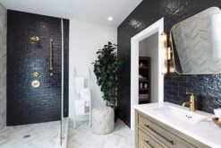 Seen on HGTV – Season 2 Episode 3 of Rock the Block Tiffany Brooks and David Bromstad’s master bathroom with our Mallorca Black zellige-style ceramic tiles or a modern black and wood master suite! The combination of glossy black ceramic subway tiles behind the vanity backsplash and in the walk-in shower with white oak chevron walls and bathroom floor and tiled bathtub surround was a total winner in our book!